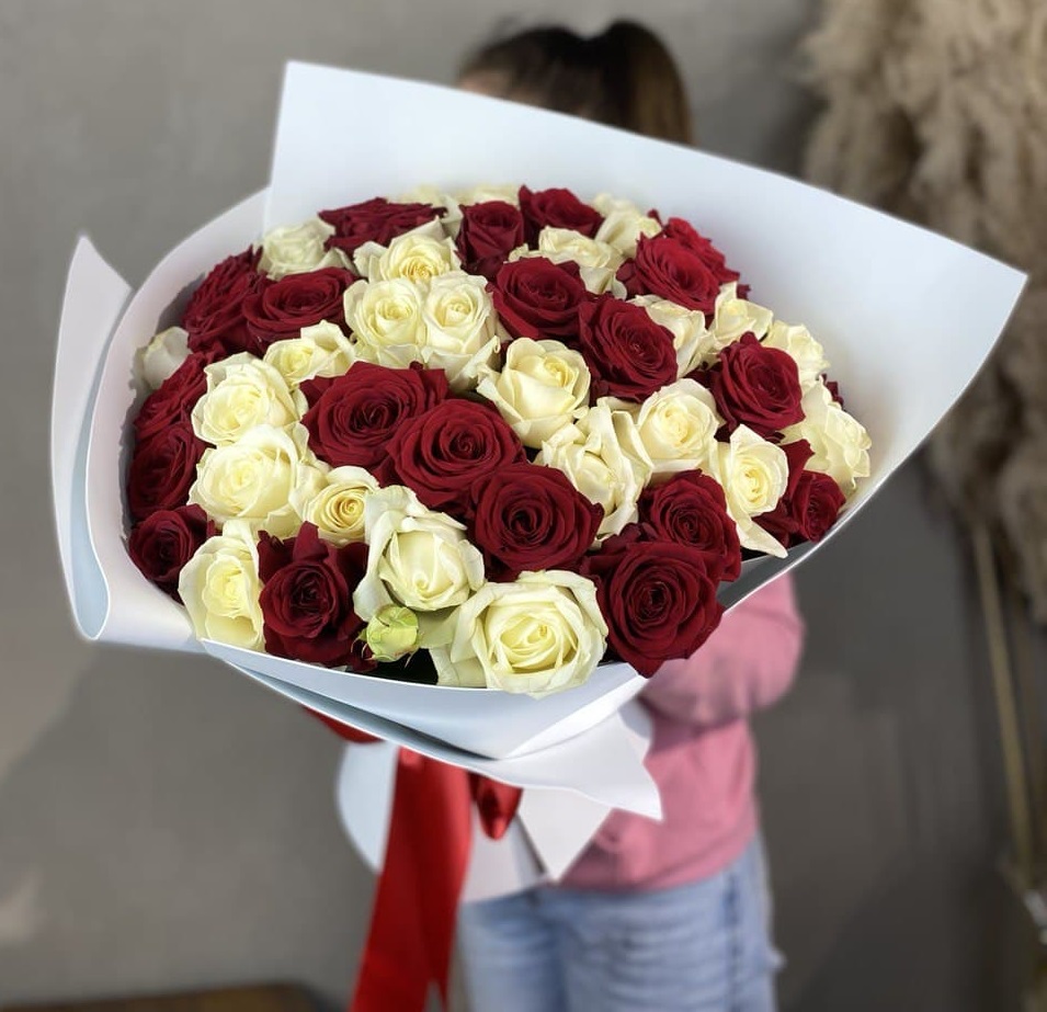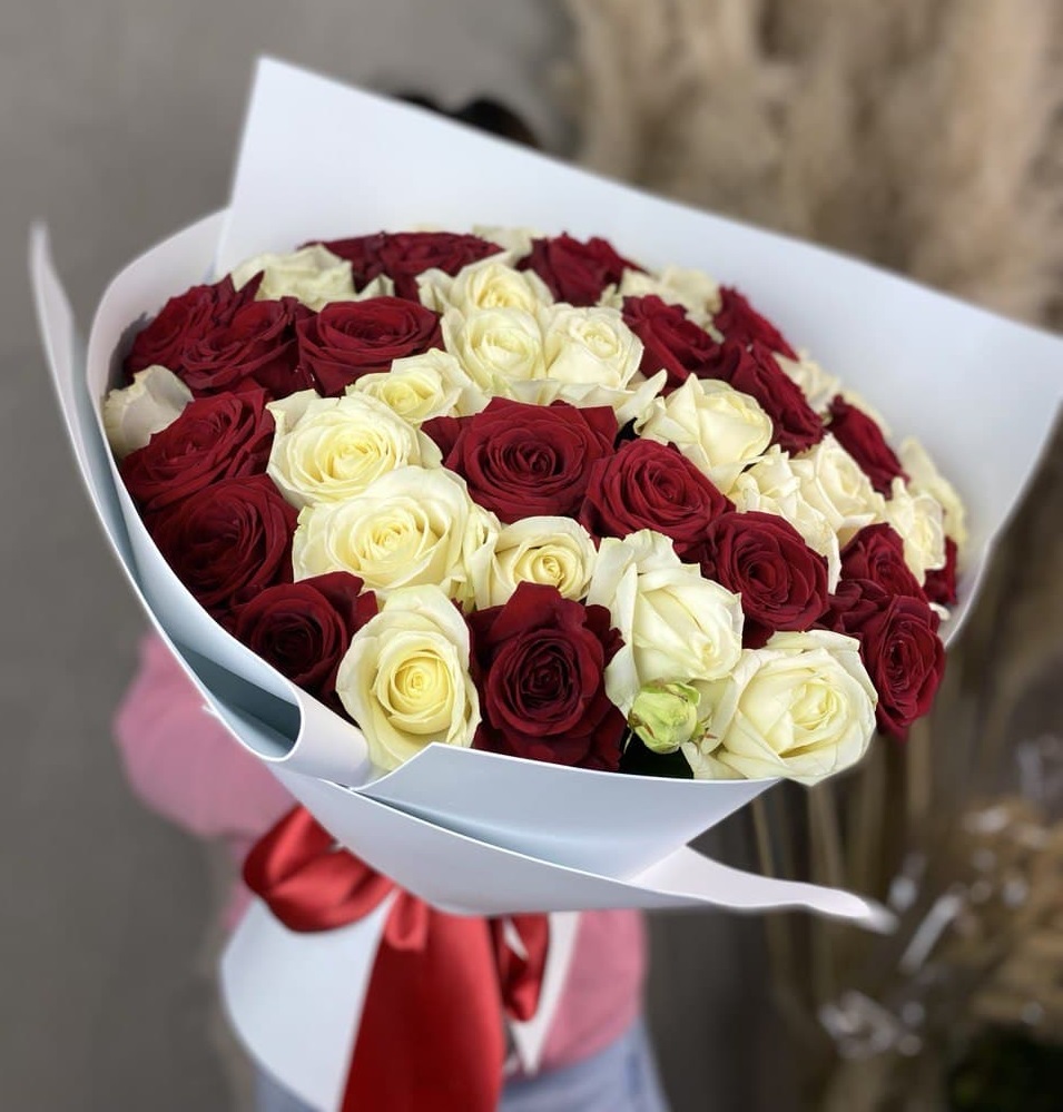 51 роза мадам ред в нежном оформлении