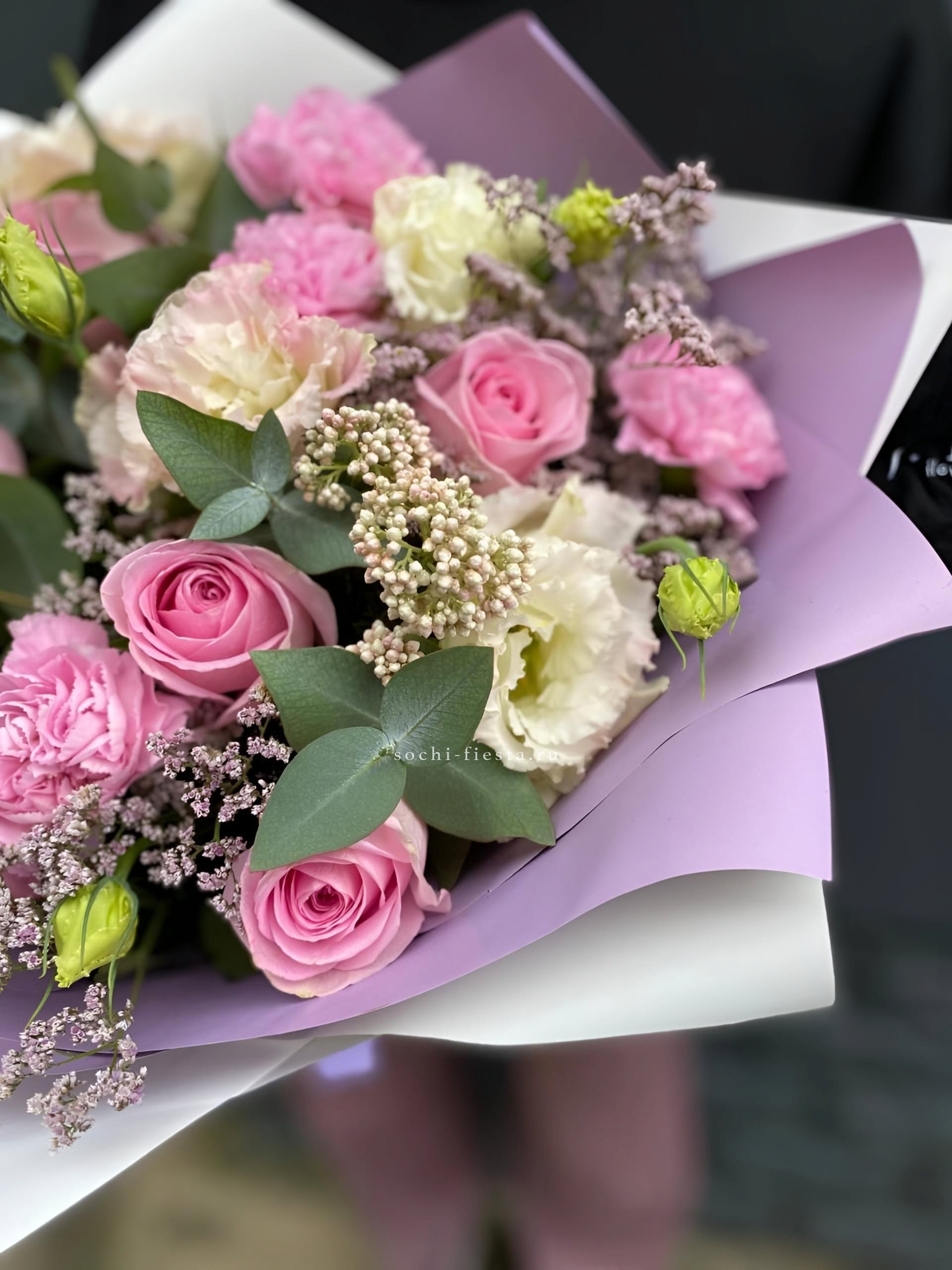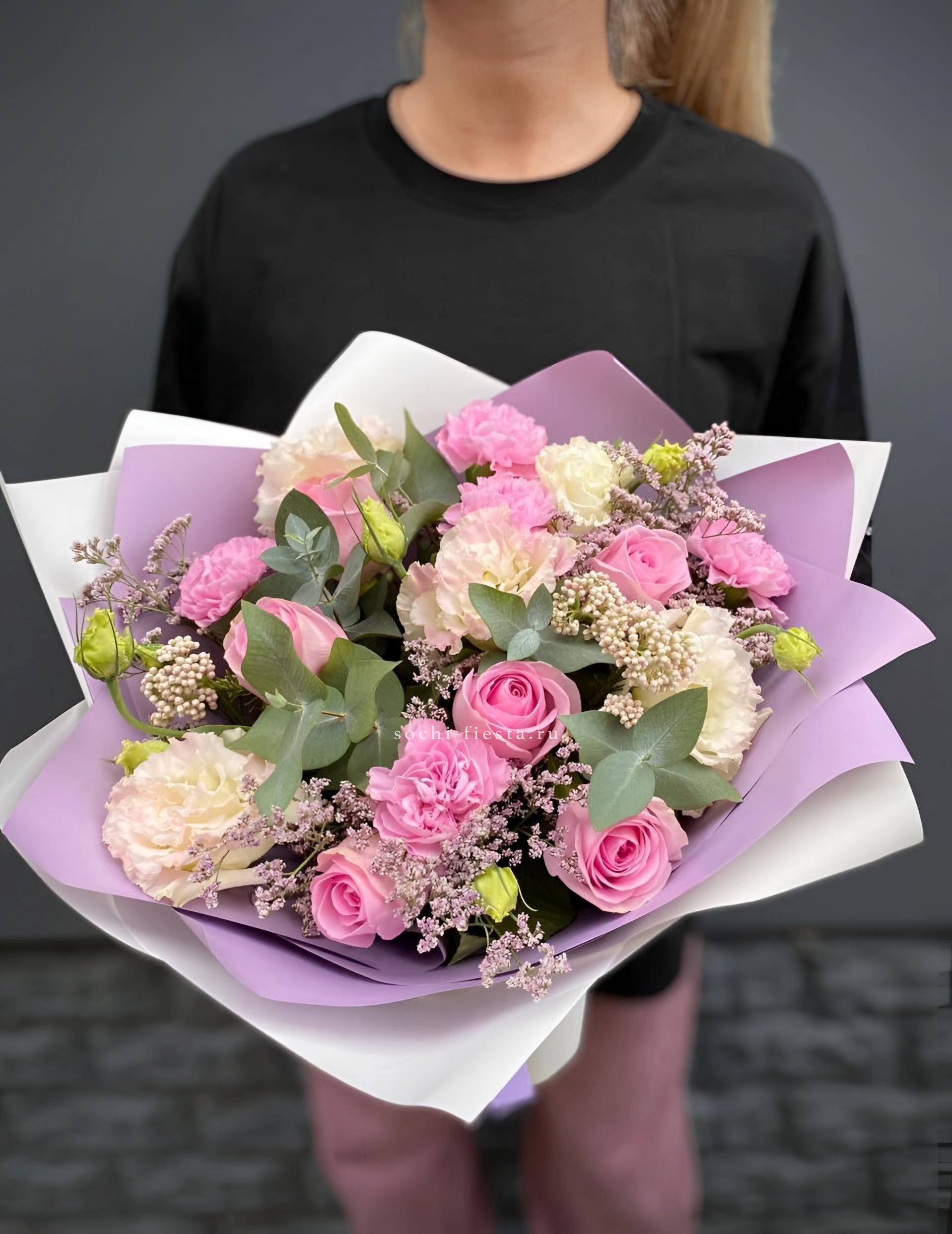 Французские розы распускаются мягкими облаками пудрового оттенка. Лимониум добавляет воздушности, а эвкалипт создает свежую основу. Букет собран так, что каждый бутон виден и дышит.