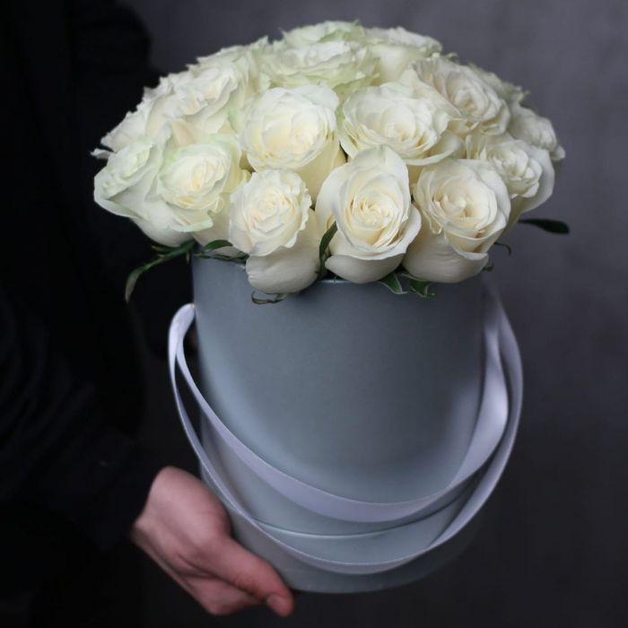 вывернутые белые розы и джумилия, цилиндр D16, эвкалипт, лента, упаковка.