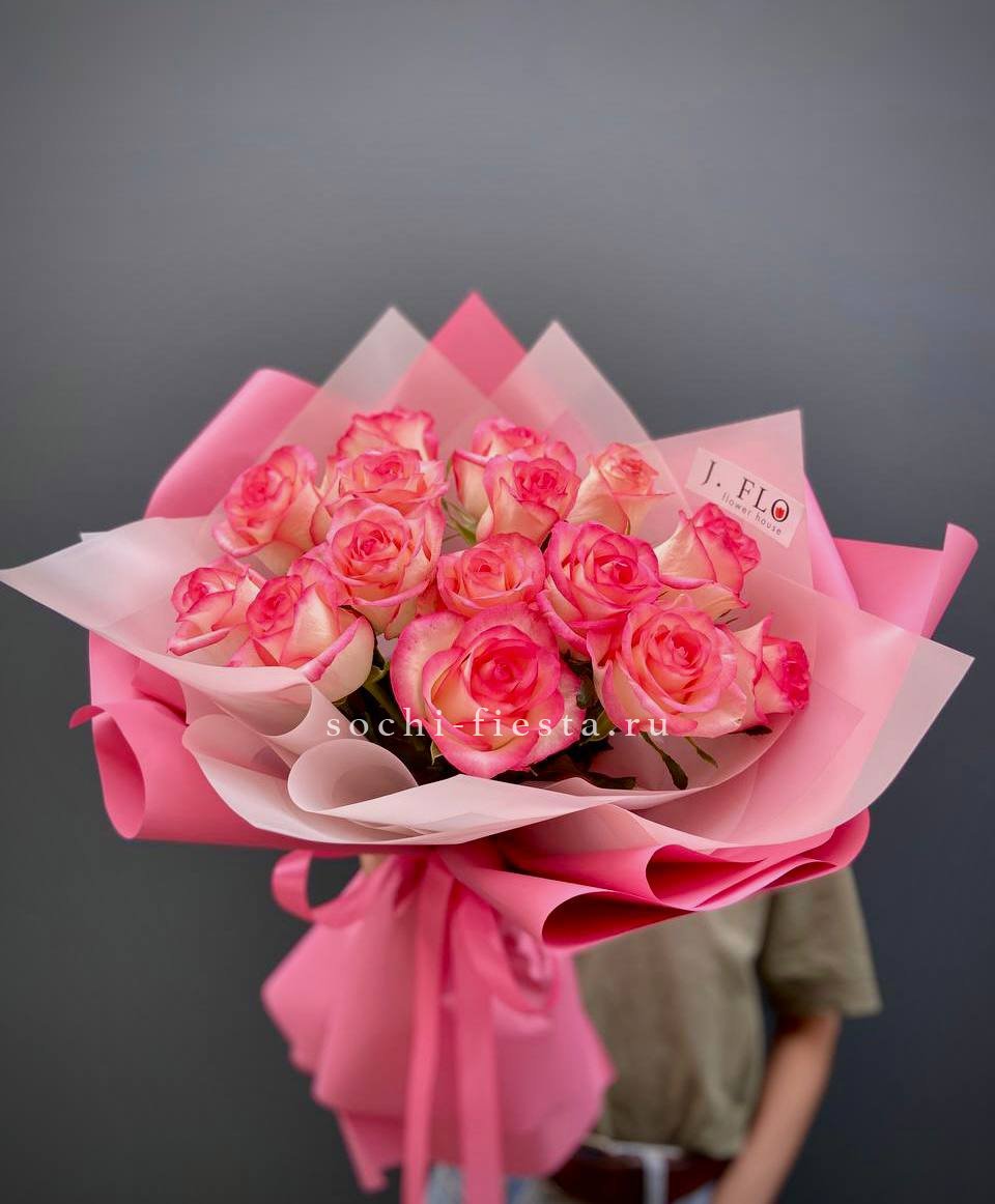 15 роз сорта джумилия, лента, дизайнерская упаковка.