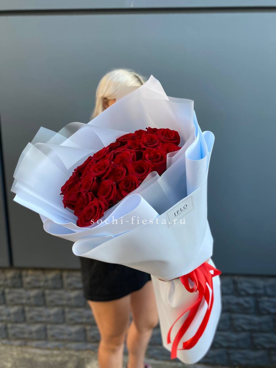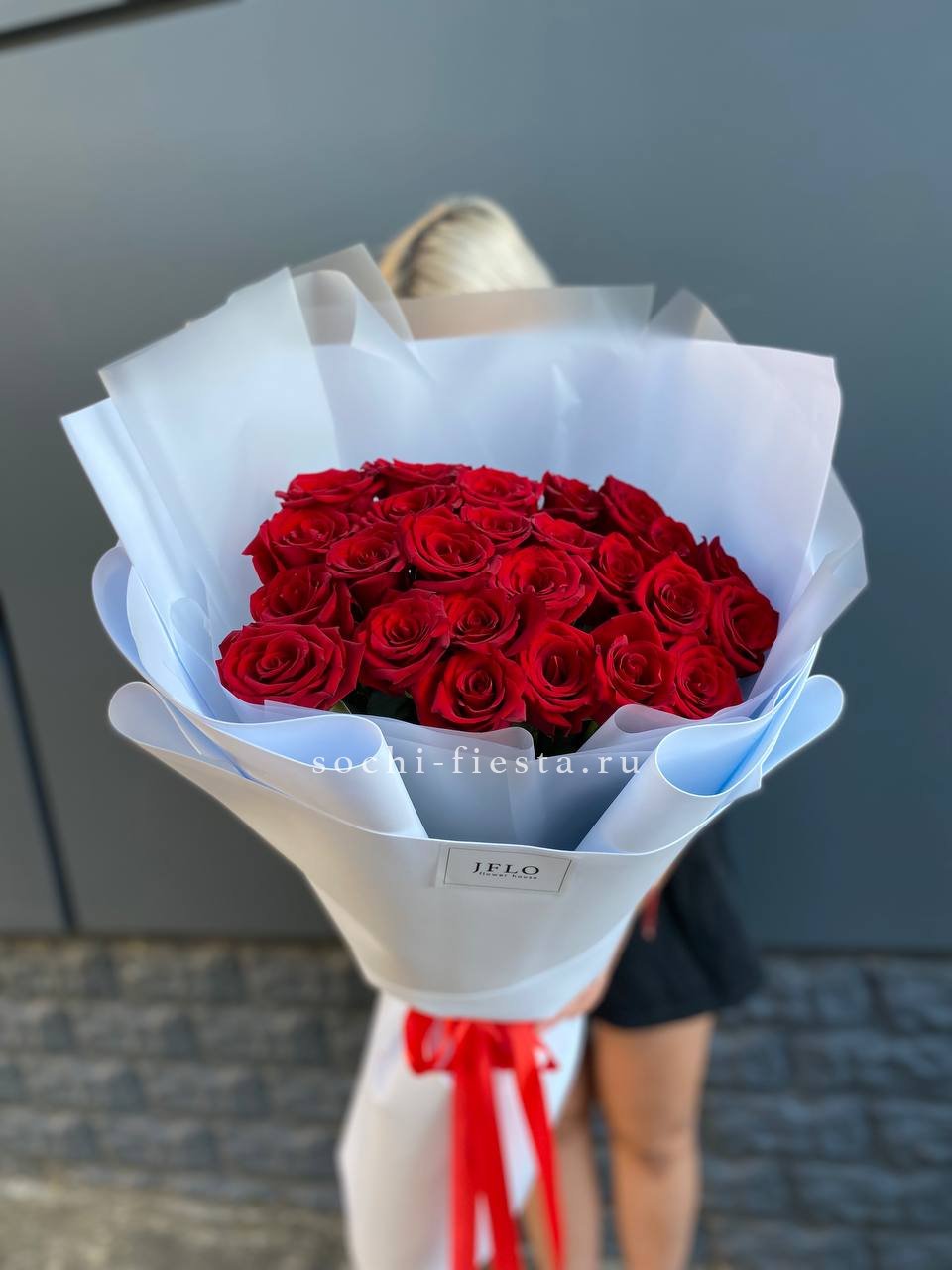 Двадцать одна роза глубокого красного оттенка собрана в плотную композицию с бордовым амарантом и натуральными сухоцветами. Насыщенность цвета создает выразительный образ, а округлая коробка сохраняет форму и свежесть бутонов надолго.