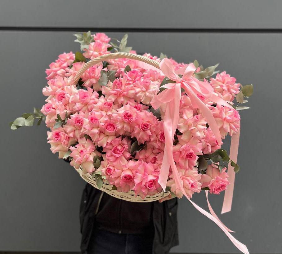 То самое «облако» нежности, о котором мечтает каждая! Эта огромная корзина французских роз поражает своим объемом и воздушностью. Специальная техника выворачивания лепестков превращает каждый бутон в пышное совершенство. Это не просто подарок, а масштабный жест любви и обожания, который точно запомнится надолго.
