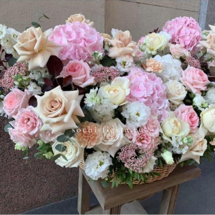 - Корзина-гигант — плетёная корзина из сезонных цветов для открытия бизнеса и торжественных вручений.