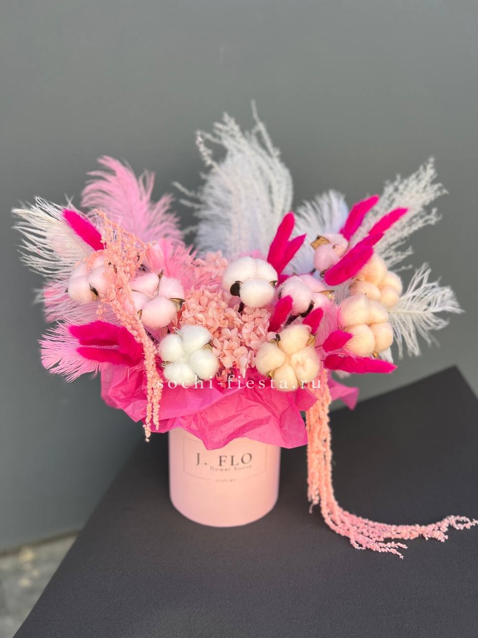 гортензия, розы, протея, озотамнус, орхидея, пионовидные кустовые розы различных сортов, эустома, листья стрелиции (или аналог), аспарагус, эвкалипт, деревянный бокс Готовая композиция может иметь незначительные внешние отличия от примера на фотографии, вместе с тем, сохранит гамму и фактуру.