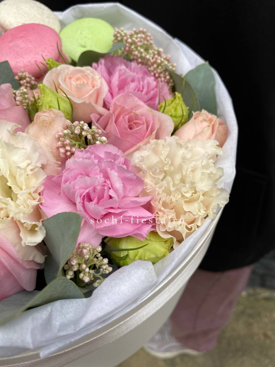 Пудровые розы и кустовые соцветия собраны с диантусами и озотамнусом в округлую форму. Шесть макаронс завершают композицию и создают ощущение домашнего уюта.
