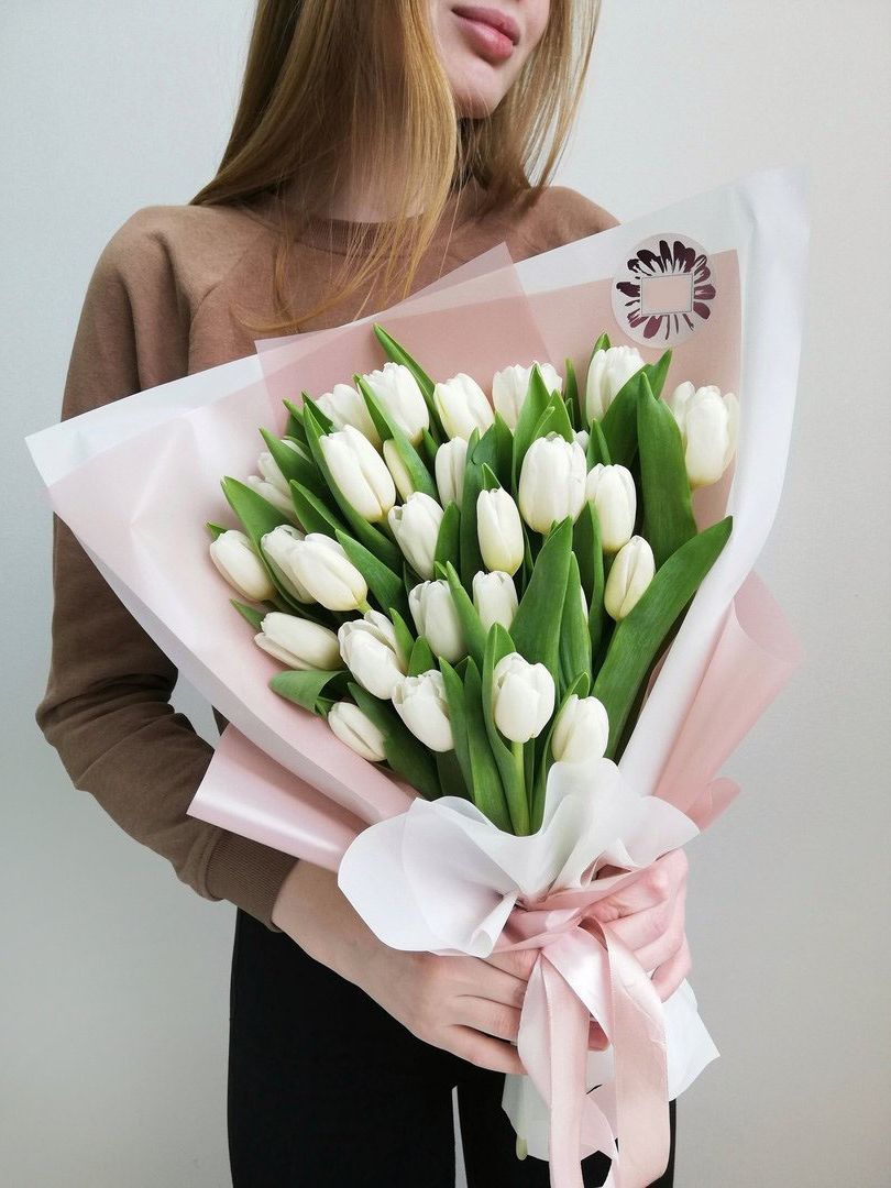 Белые тюльпаны в минималистичной подаче впишутся в светлый интерьер или просторную студию. Чистые линии и свободная сборка создают ощущение воздуха и простора. Монохромная гамма работает на спокойствие и визуальный порядок.