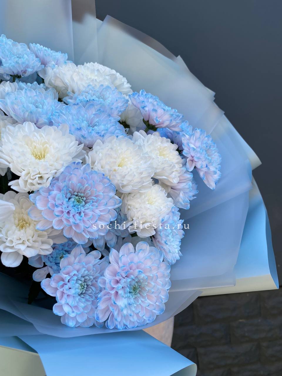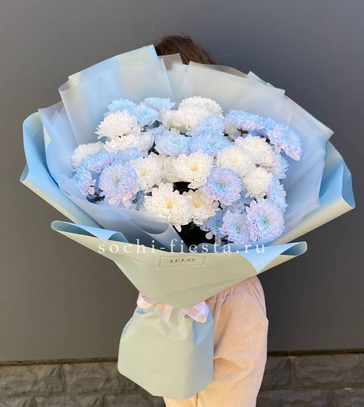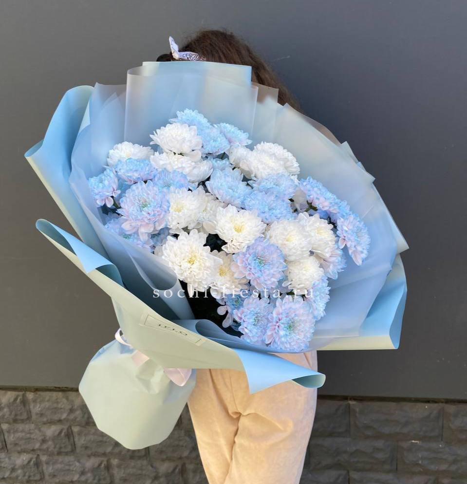 Девять кустов хризантемы в синих тонах собраны в плотную шапку. Каждый стебель несёт множество мелких соцветий, которые раскрываются постепенно. Такой букет сохраняет свежесть долго и радует насыщенным цветом.