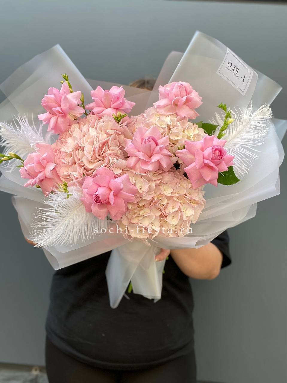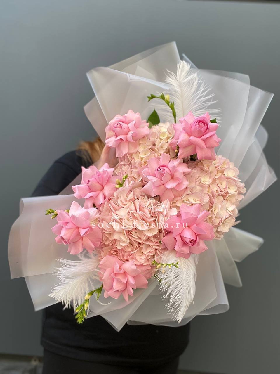 гортензия, хризантема, белая роза, гербера, статица, хлопок, упаковка.