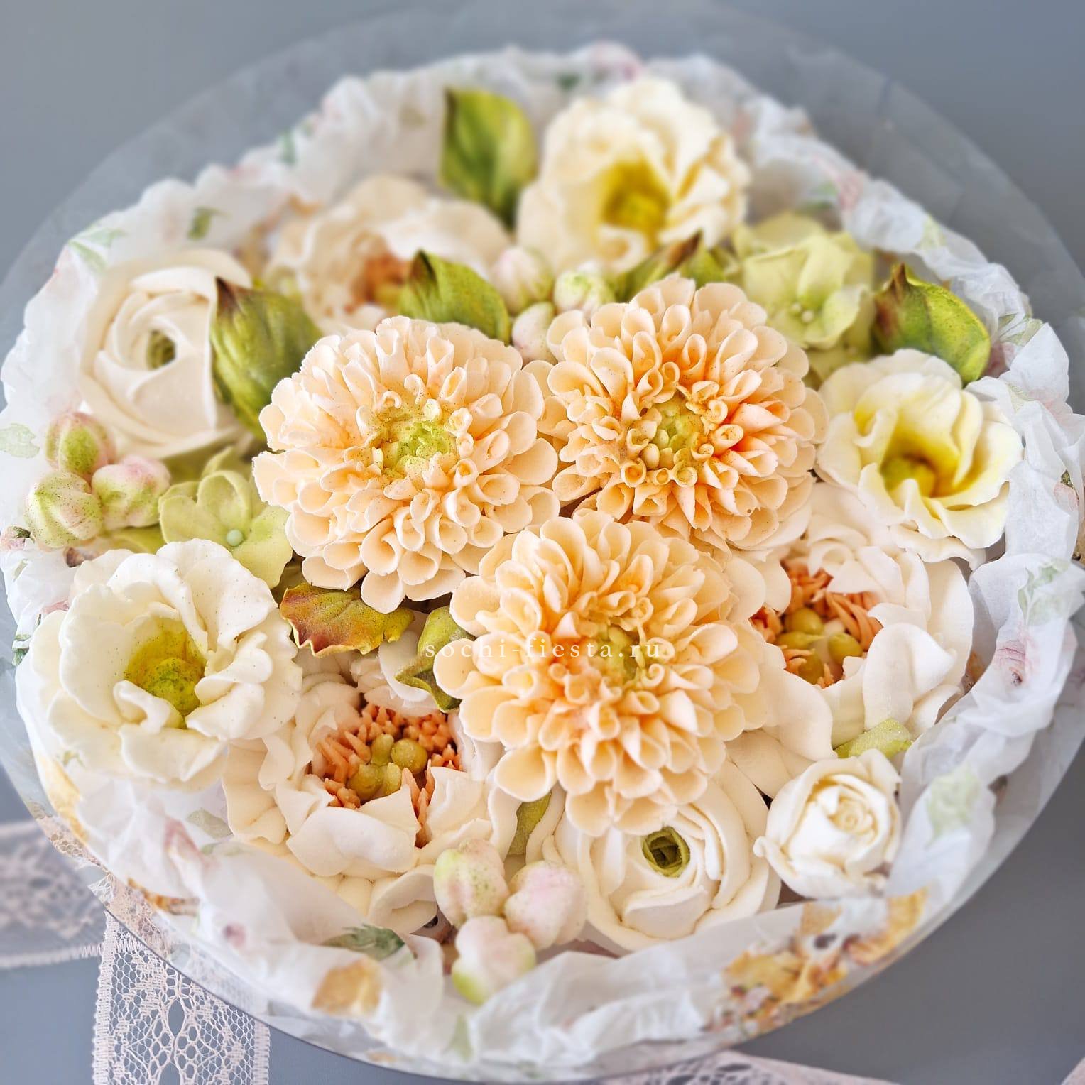 Белоснежные розы и герберы соседствуют с пушистыми шапками хризантем и воздушной статицей. Хлопок добавляет фактурный акцент, делая композицию объёмной и запоминающейся.