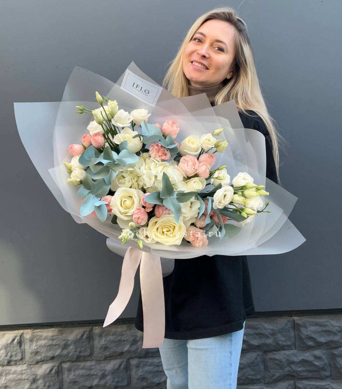 Розы и гортензия формируют объемную текстуру, где каждый бутон раскрыт по-своему. Эустома заполняет пространство между крупными соцветиями, а эвкалипт обрамляет композицию мягкой зеленой волной.