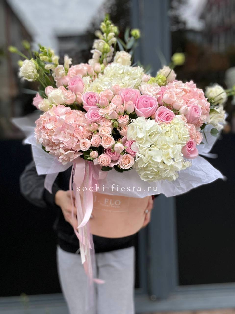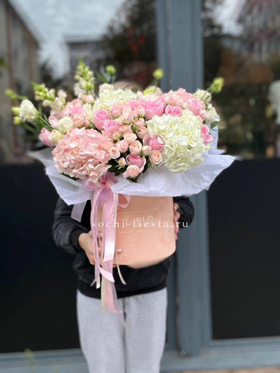 гортензия - 11 шт., пионовидная кустовая роза Мисти Баблс 7 шт., лента, дизайнерская упаковка.