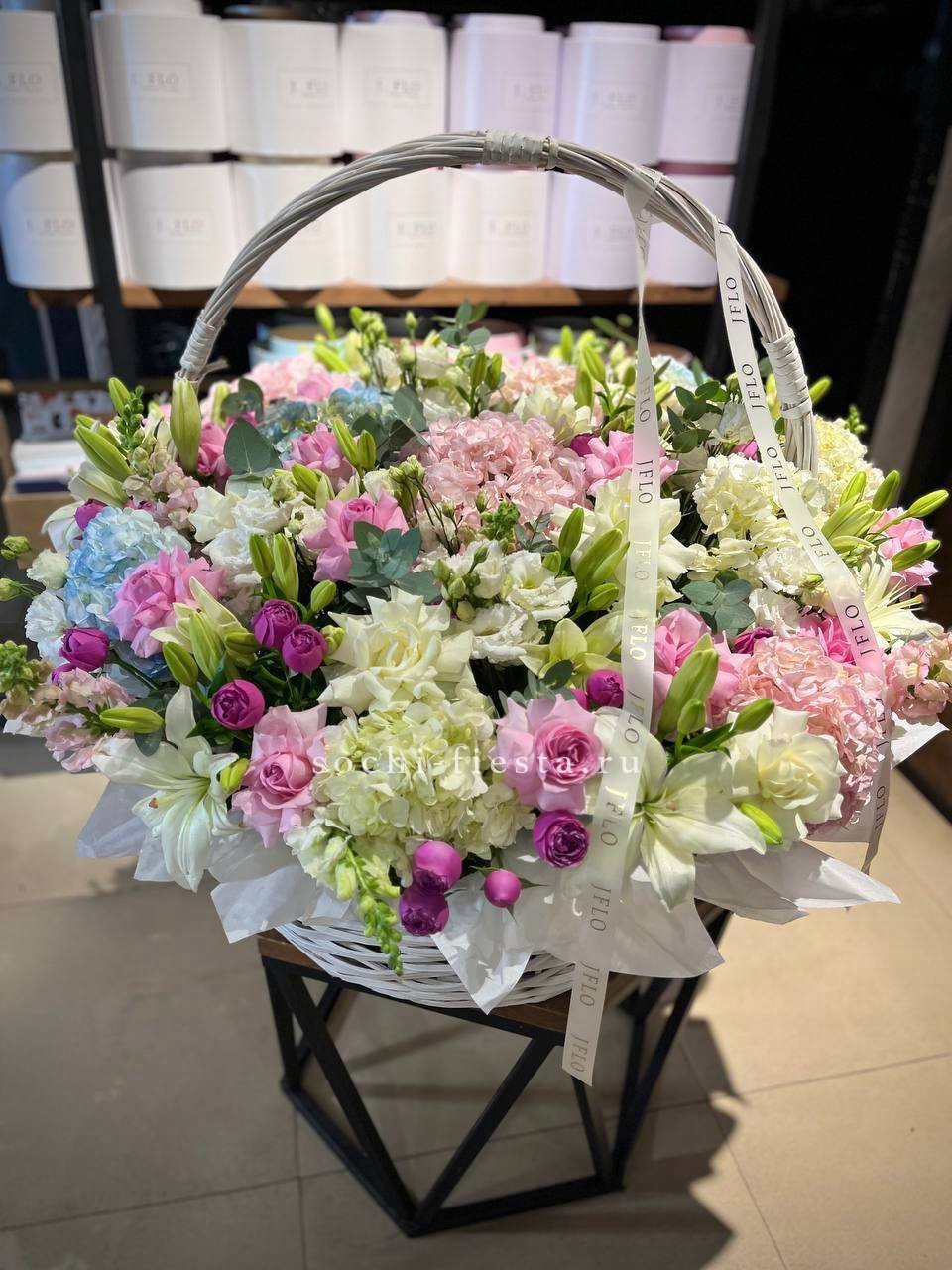 Пышная гортензия обволакивает кустовые розы Мисти Баблс, создавая плотную текстуру с переходами от ягодного к лавандовому. Каждый бутон раскрыт по-своему, образуя живую композицию с глубиной и объёмом.