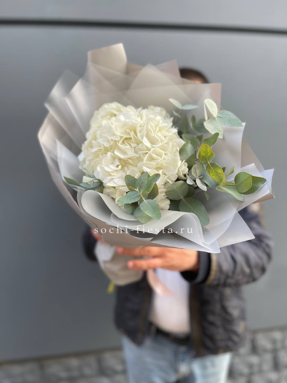 Белоснежные соцветия гортензии дополнены матовой зеленью эвкалипта, которая задаёт букету спокойный природный ритм. Композиция выглядит свободно и естественно, сохраняя графичность линий.