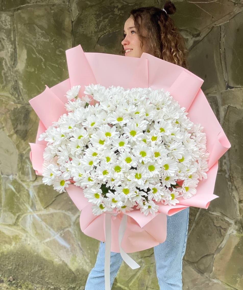 Семь веток кустовой хризантемы обрамлены лавандовым фоамираном, который мягко перекликается с оттенками бутонов. Композиция собрана свободно, сохраняя естественную пластику стеблей и живость форм.