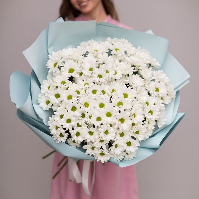 Девять кустовых хризантем сплетаются с пушистыми колосками лагуруса в воздушную композицию. Мягкие текстуры и природная простота создают ощущение прогулки по летнему полю.