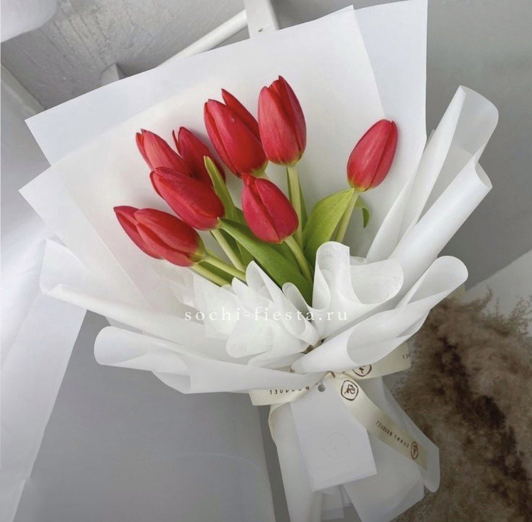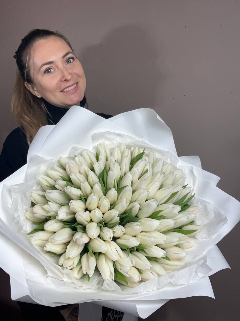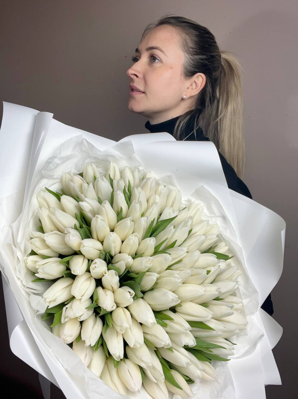 Сто один белоснежный тюльпан собран в плотную охапку с безупречной геометрией. Классическая упаковка сохраняет естественную красоту бутонов и подчёркивает масштаб композиции.