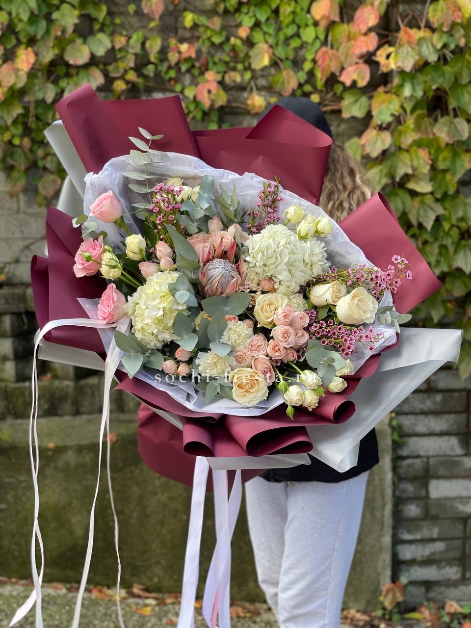 Протея задаёт графичный центр композиции, вокруг которого раскрываются пышные шапки гортензий и плотные бутоны роз. Хамелациум и бомбастик создают воздушную текстуру по краям, а эвкалипт добавляет серебристые штрихи между крупными соцветиями.
