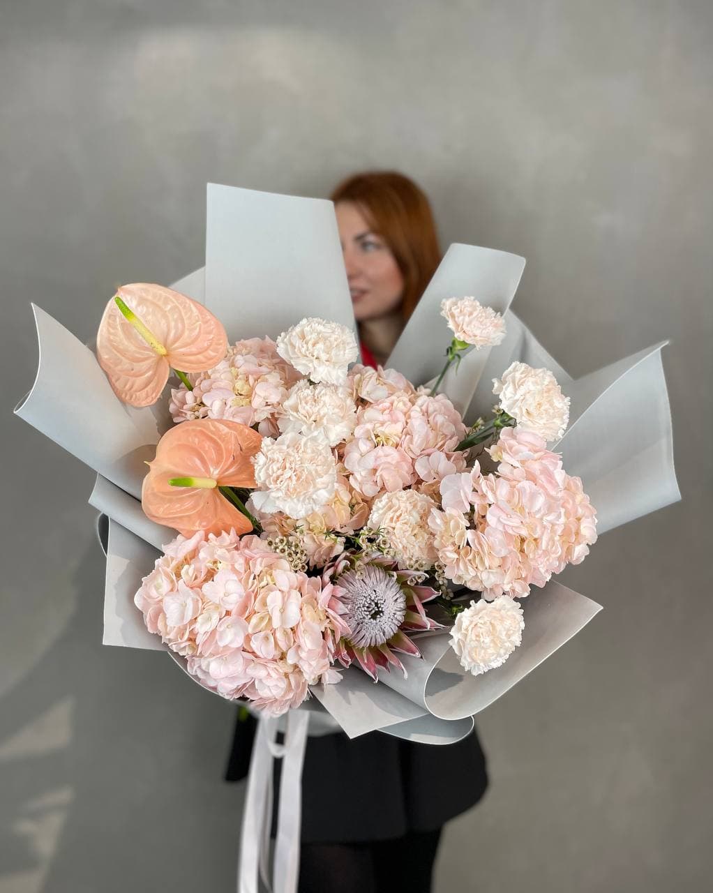 Гортензии и пионы задают основной объем, пионовидные розы добавляют мягкости, а маттиола вносит вертикальные линии. Букет выглядит наполненным и цельным.