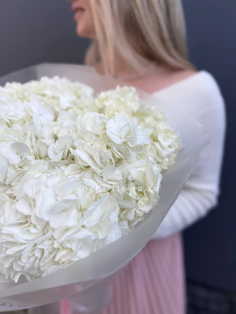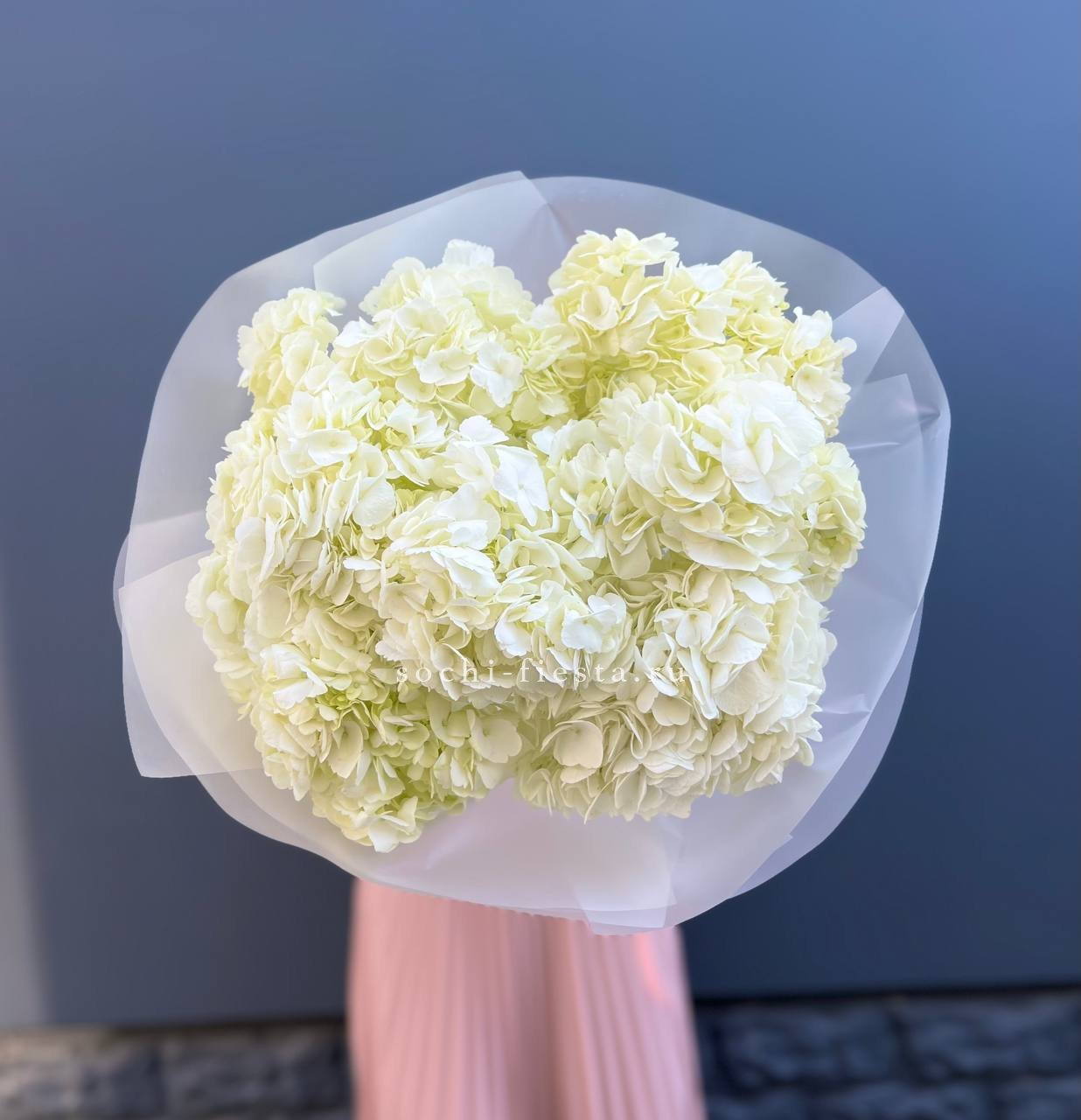 гортензия, роза одноголовая, роза кустовая Мисти Баблс, эустома, диантус, эвкалипт, лента, дизайнерская упаковка.