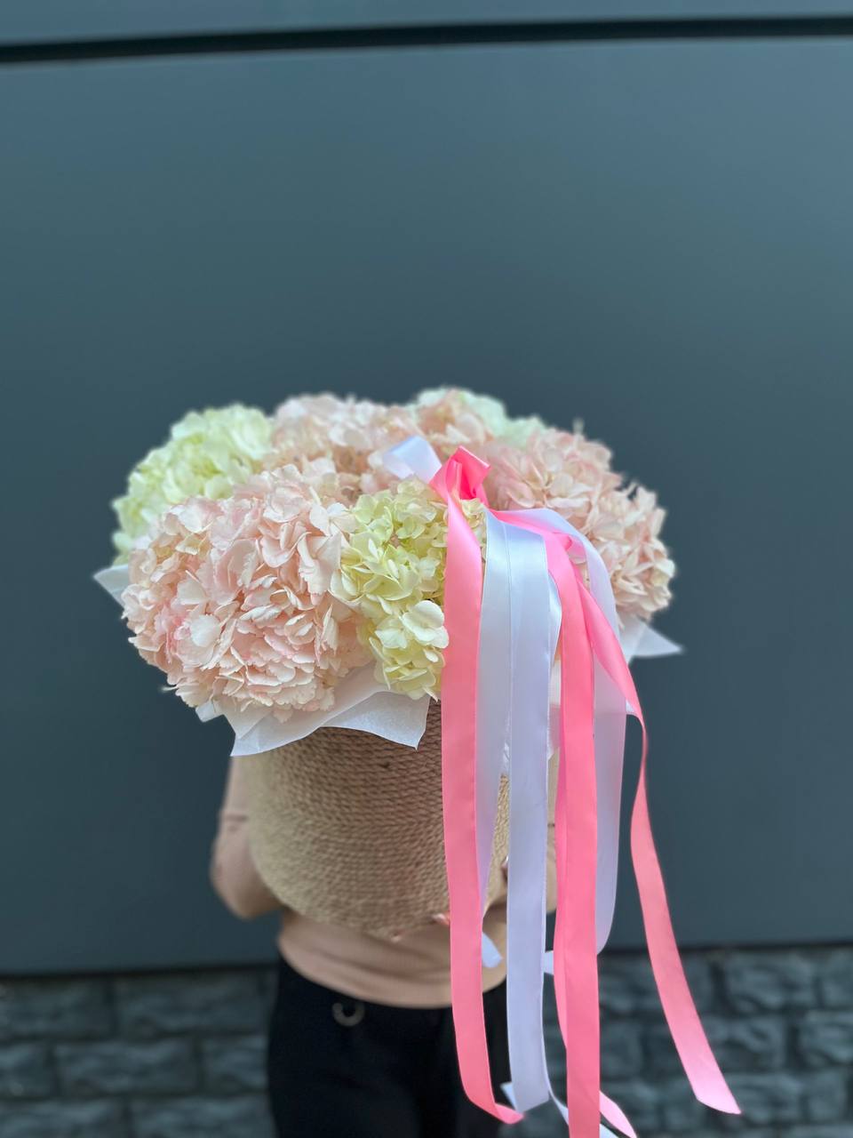 пионы, лилии, белые розы, эустомы, диантусы, маттиолы, статица, альстромерия, эвкалипт, цилиндр - D25, лента, упаковка. Состав может меняться в зависимости от сезона.