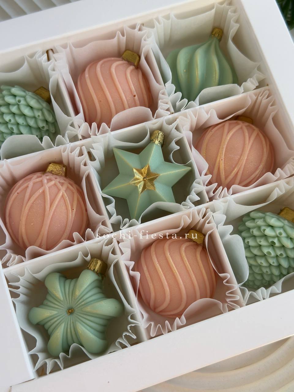 Девять елочных шаров из бельгийского шоколада с авторской росписью. Пастельные тона и ручное декорирование превращают набор в самостоятельный акцент праздничного стола.