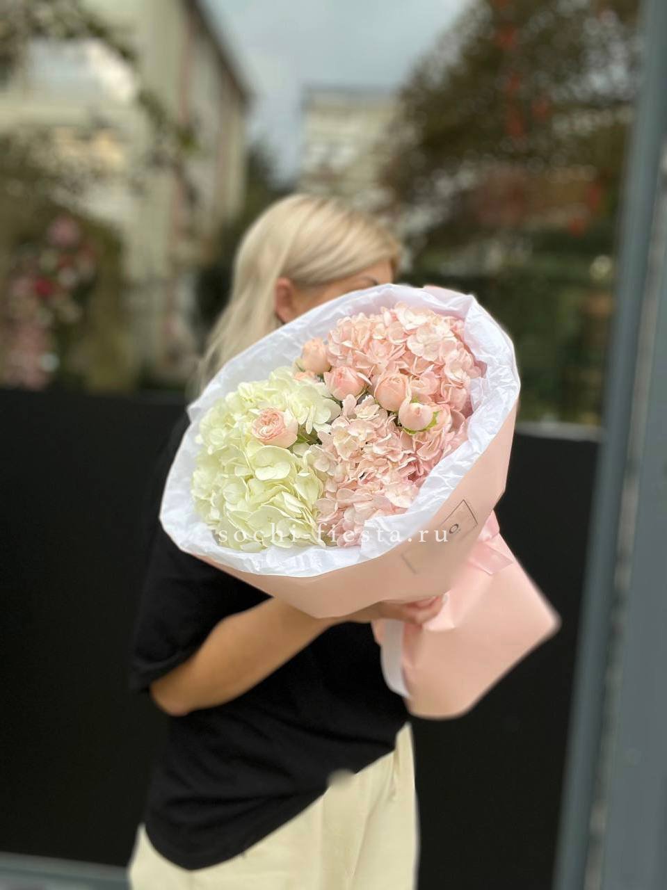 Крупные шапки гортензии соседствуют с пышными кустовыми розами сорта Бомбастик. Два растения образуют спокойный дуэт с акцентом на природную форму каждого бутона.