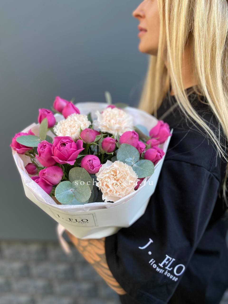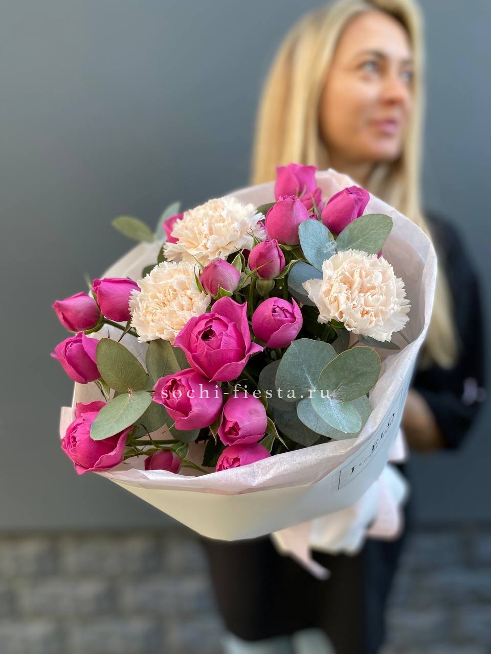 Пионовидные розы соседствуют с классическими, создавая игру объёмов и плотности бутонов. Диантус вплетается между ними легкими штрихами. Эвкалипт добавляет воздуха и завершает силуэт.