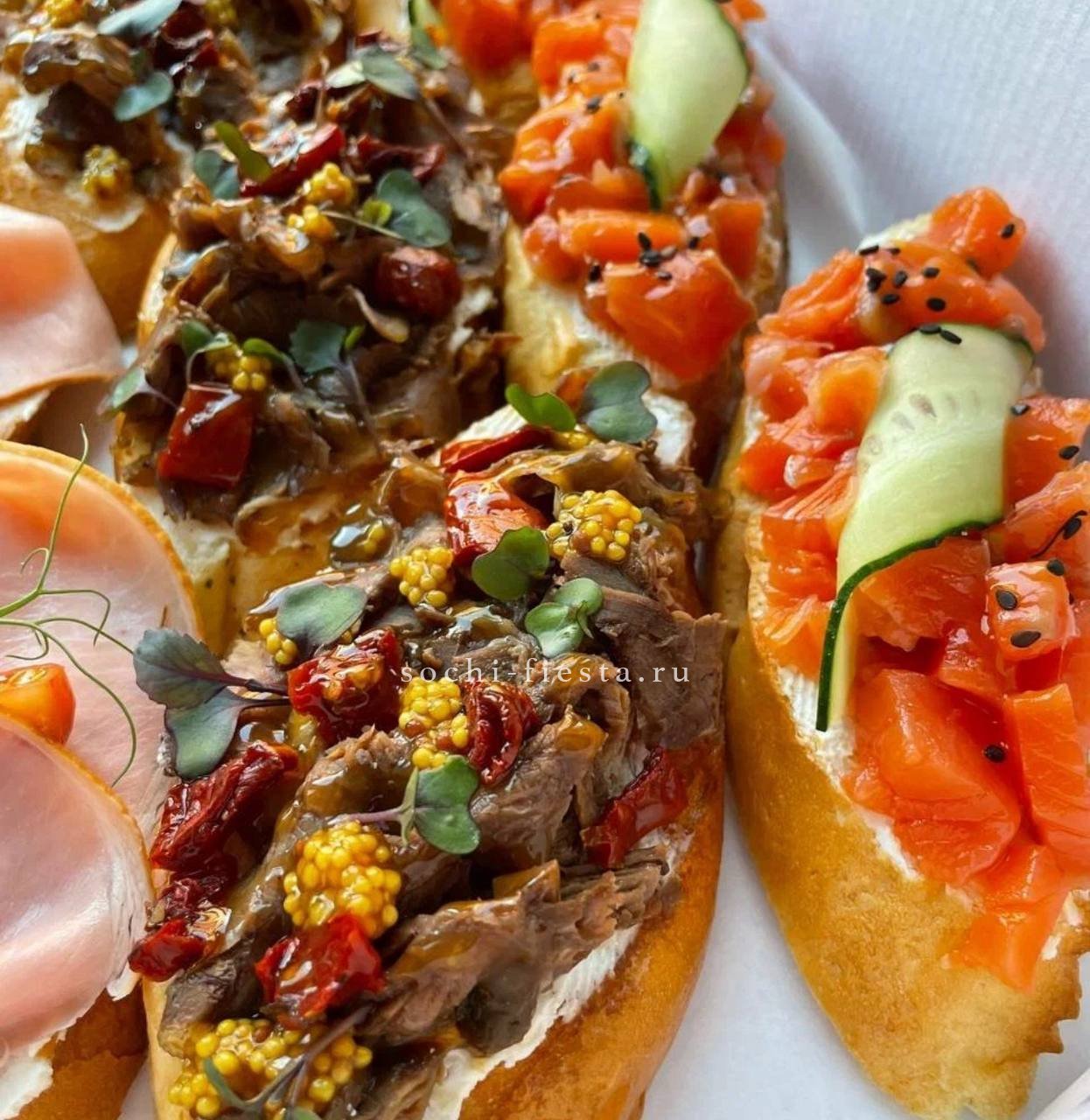 Лёгкие закуски собраны в один формат: хрустящие тосты с лососем, тарталетки с рыбным рийетом и фаршированные яйца. Каждая позиция готова к подаче и не требует дополнительной сервировки.