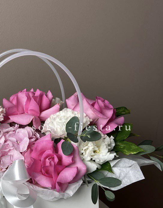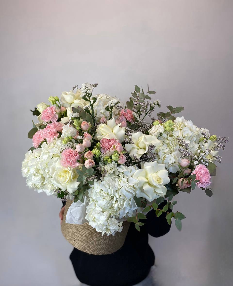 хризантемы, герберы, розы, антиринум, диантус, гортензия, бомбастик, озатамус в коробке или корзине на выбор.