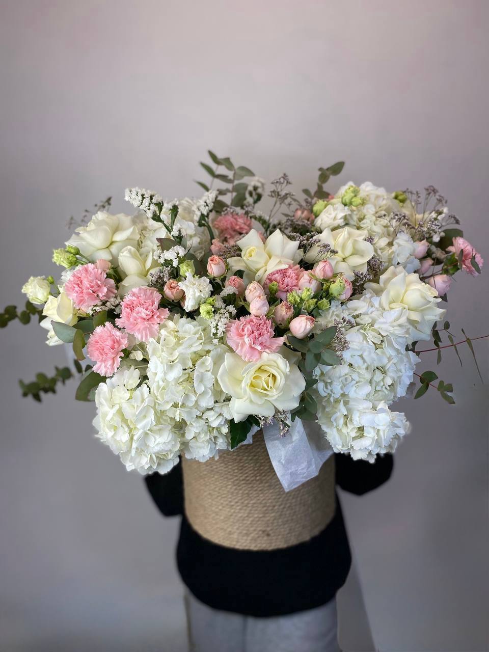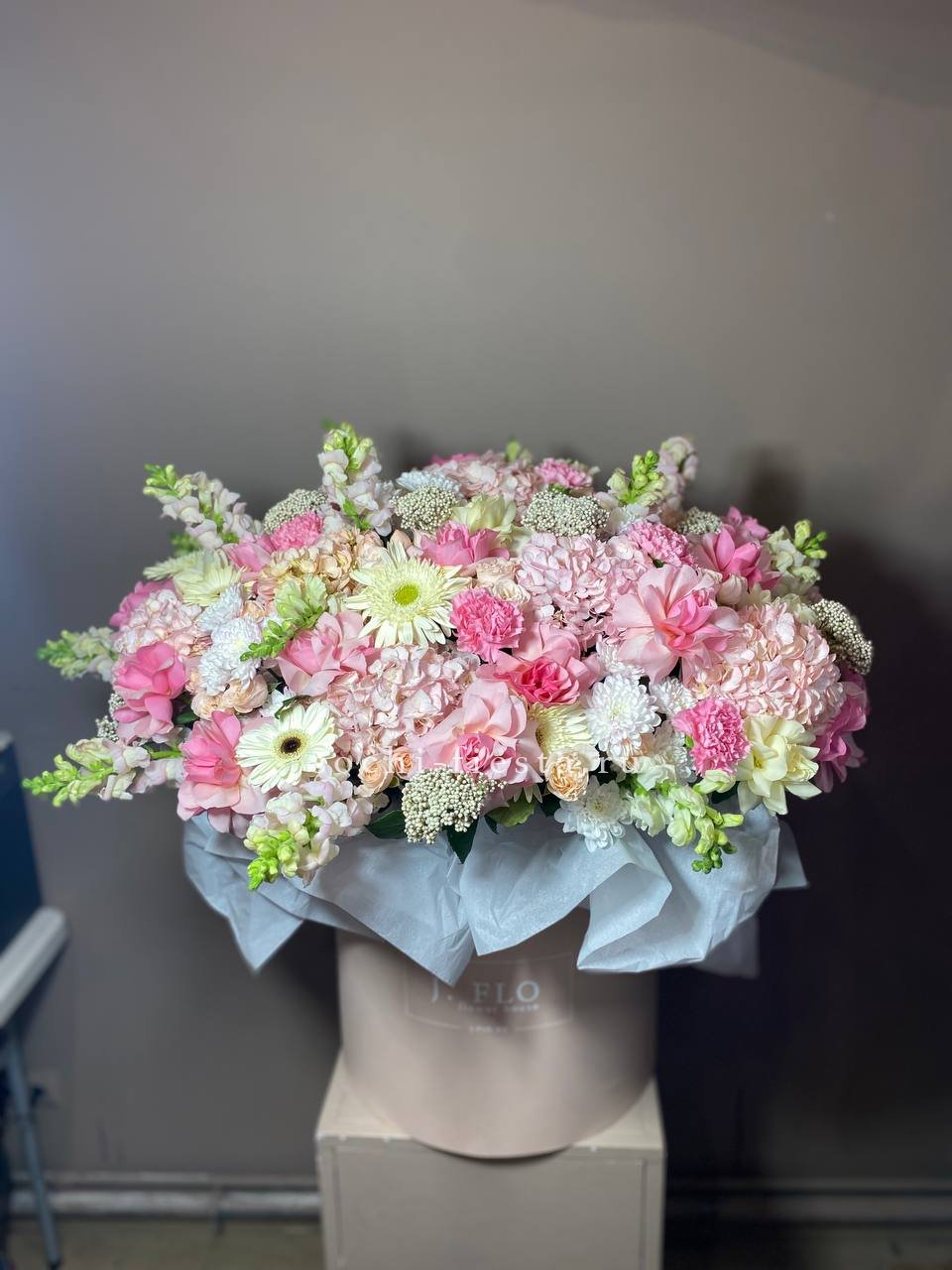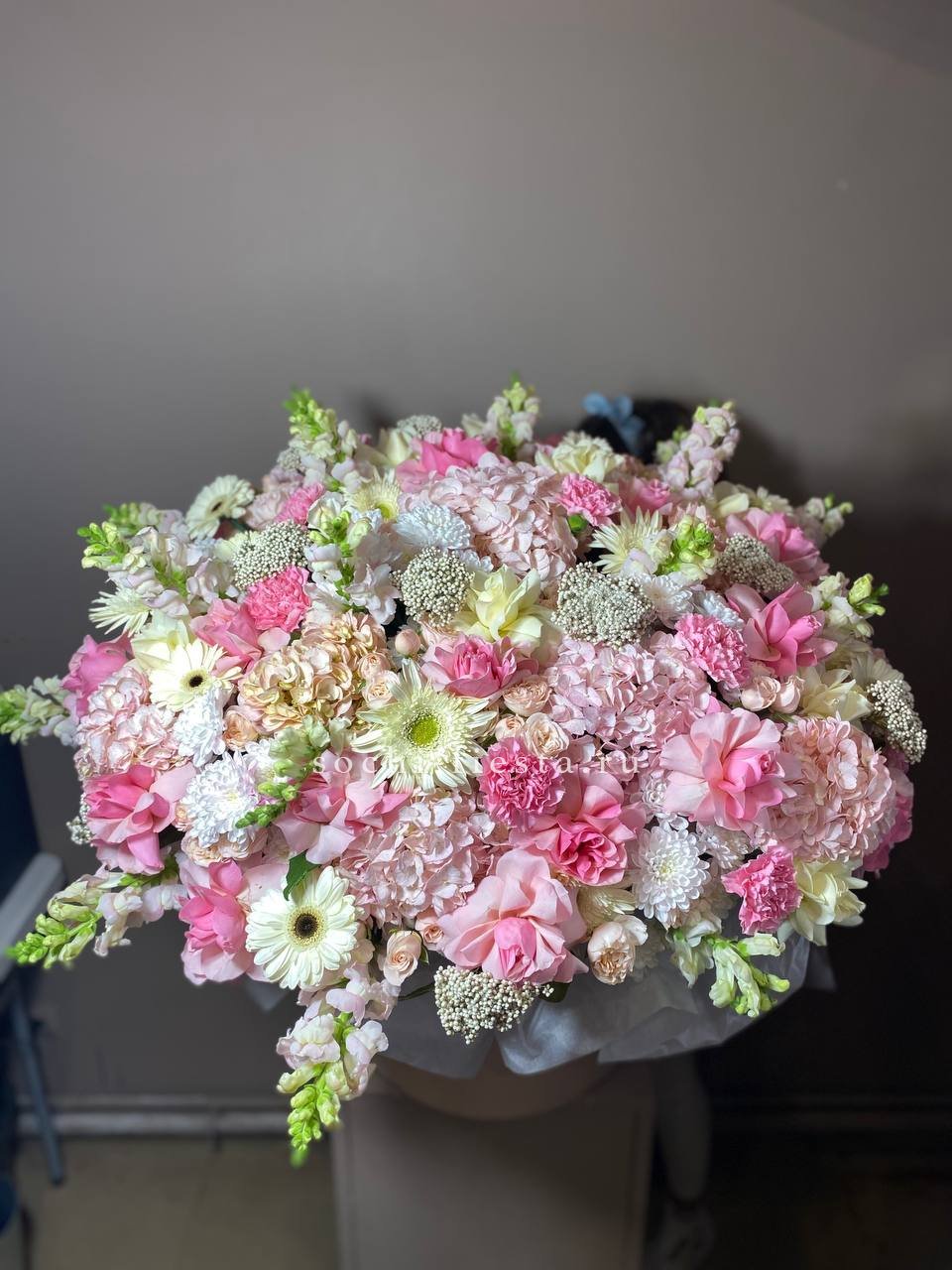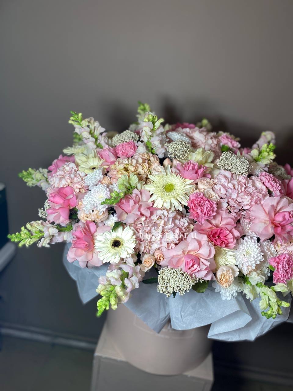 Масштабная композиция объединяет хризантемы, герберы, розы, антиринум и гортензию в плотную структуру с яркими акцентами. Диантус и бомбастик добавляют объем, а озотамус создает текстурные переходы между крупными соцветиями.