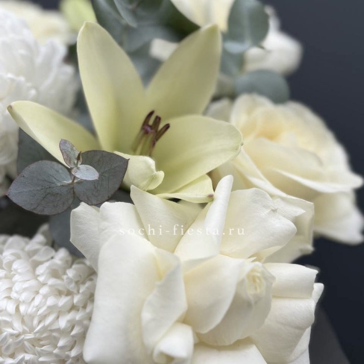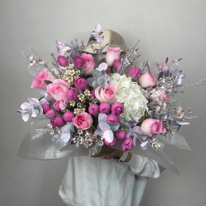 Наполнение подбирается под сезон. Зимой — амариллис, розы, ранункулюсы. Весной — тюльпаны, ранункулюсы, фрезия. Летом — пионы в мае-июне, гортензия в июле-августе. Осенью — хризантемы и декоративные травы.