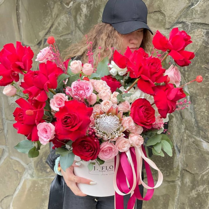 Романтические поводы — 14 февраля, годовщины, свидания. Классический вариант — красные розы в круглой коробке. Современный — пионовидные розы в крафтовой кубической упаковке.
