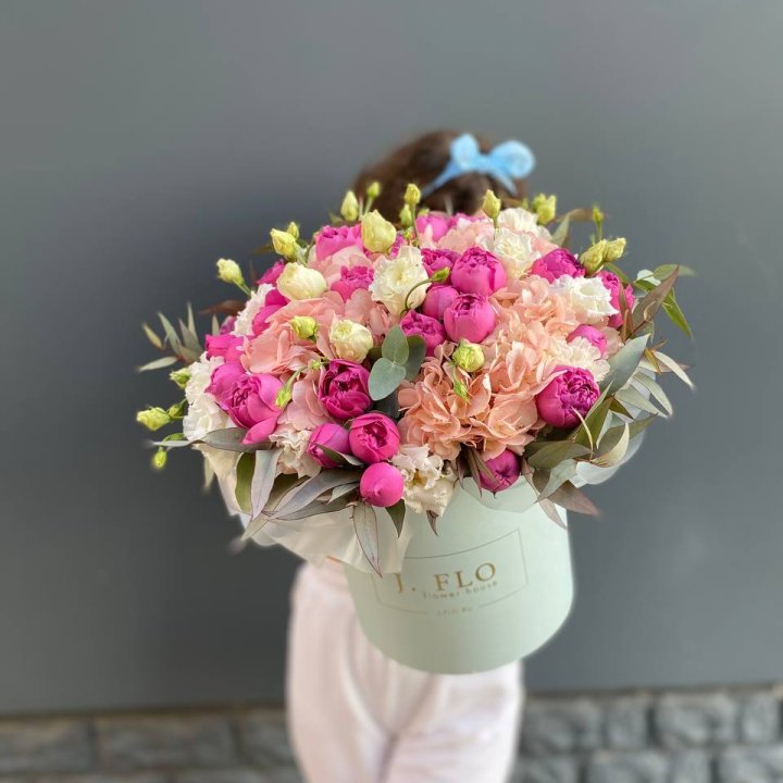 Наполнение подбирается под сезон. Зимой — амариллис, розы, ранункулюсы. Весной — тюльпаны, ранункулюсы, фрезия. Летом — пионы в мае-июне, гортензия в июле-августе. Осенью — хризантемы и декоративные травы.