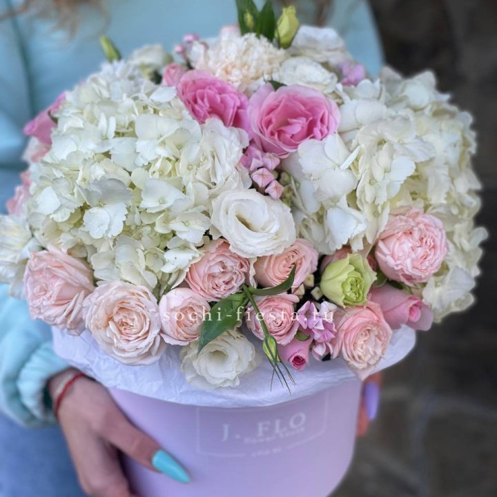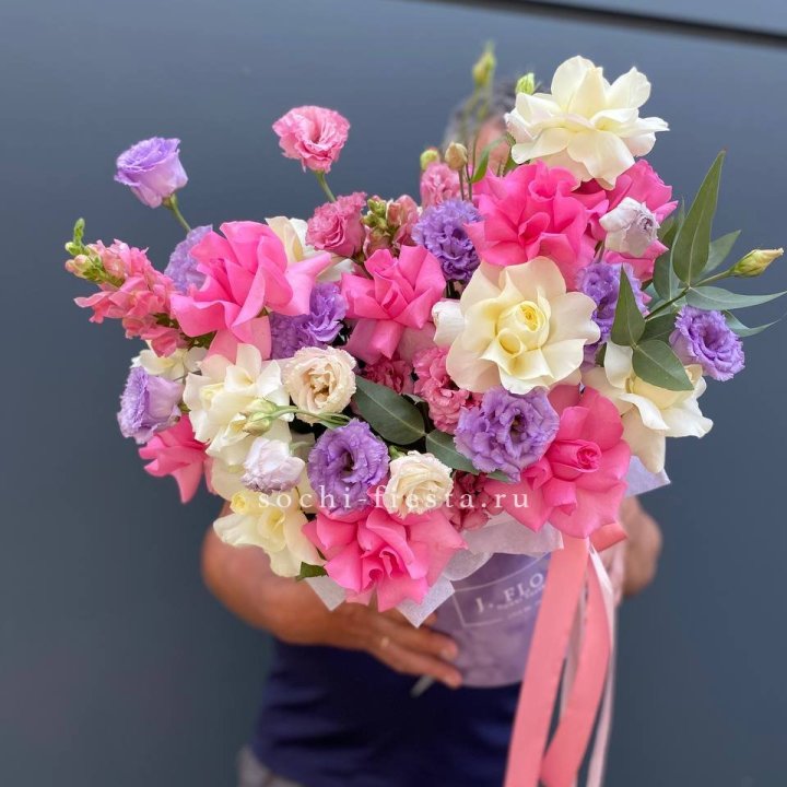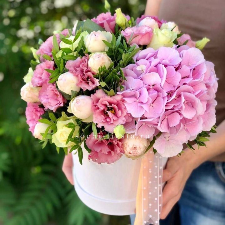 Наполнение подбирается под сезон. Зимой — амариллис, розы, ранункулюсы. Весной — тюльпаны, ранункулюсы, фрезия. Летом — пионы в мае-июне, гортензия в июле-августе. Осенью — хризантемы и декоративные травы.