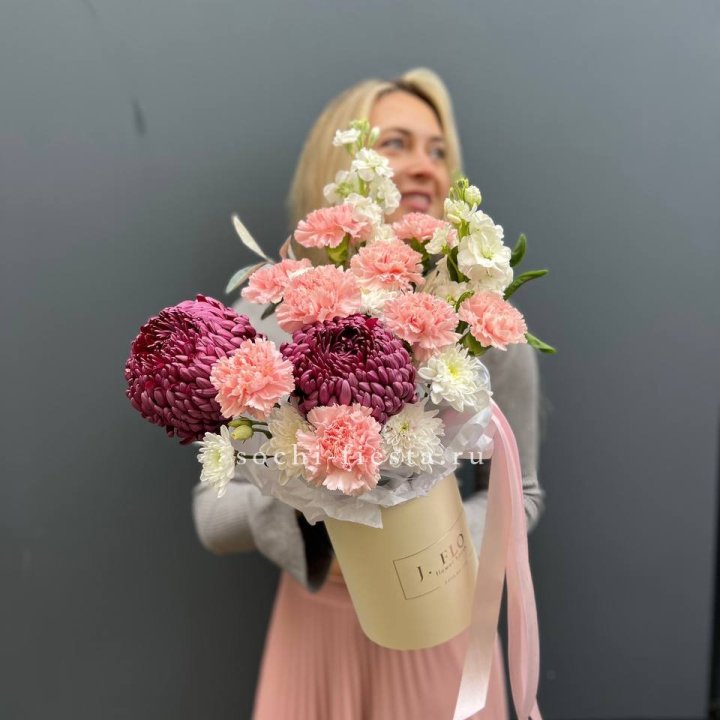 Наполнение подбирается под сезон. Зимой — амариллис, розы, ранункулюсы. Весной — тюльпаны, ранункулюсы, фрезия. Летом — пионы в мае-июне, гортензия в июле-августе. Осенью — хризантемы и декоративные травы.