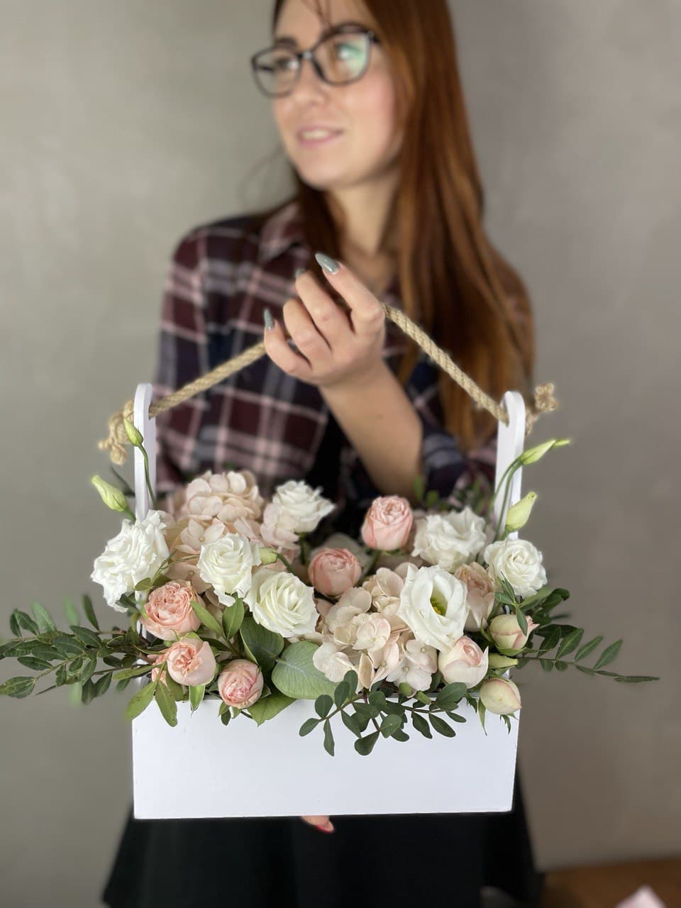 гортензия, диантус, кустовая роза, эустома, эвкалипт, гипсофила/бруния/хамелациум, деревянный ящик, пиафлор, лента Состав композиции может быть незначительно изменен флористом в процессе изготовления с соблюдением стилистики, фактуры и цветовой гаммы оригинала.