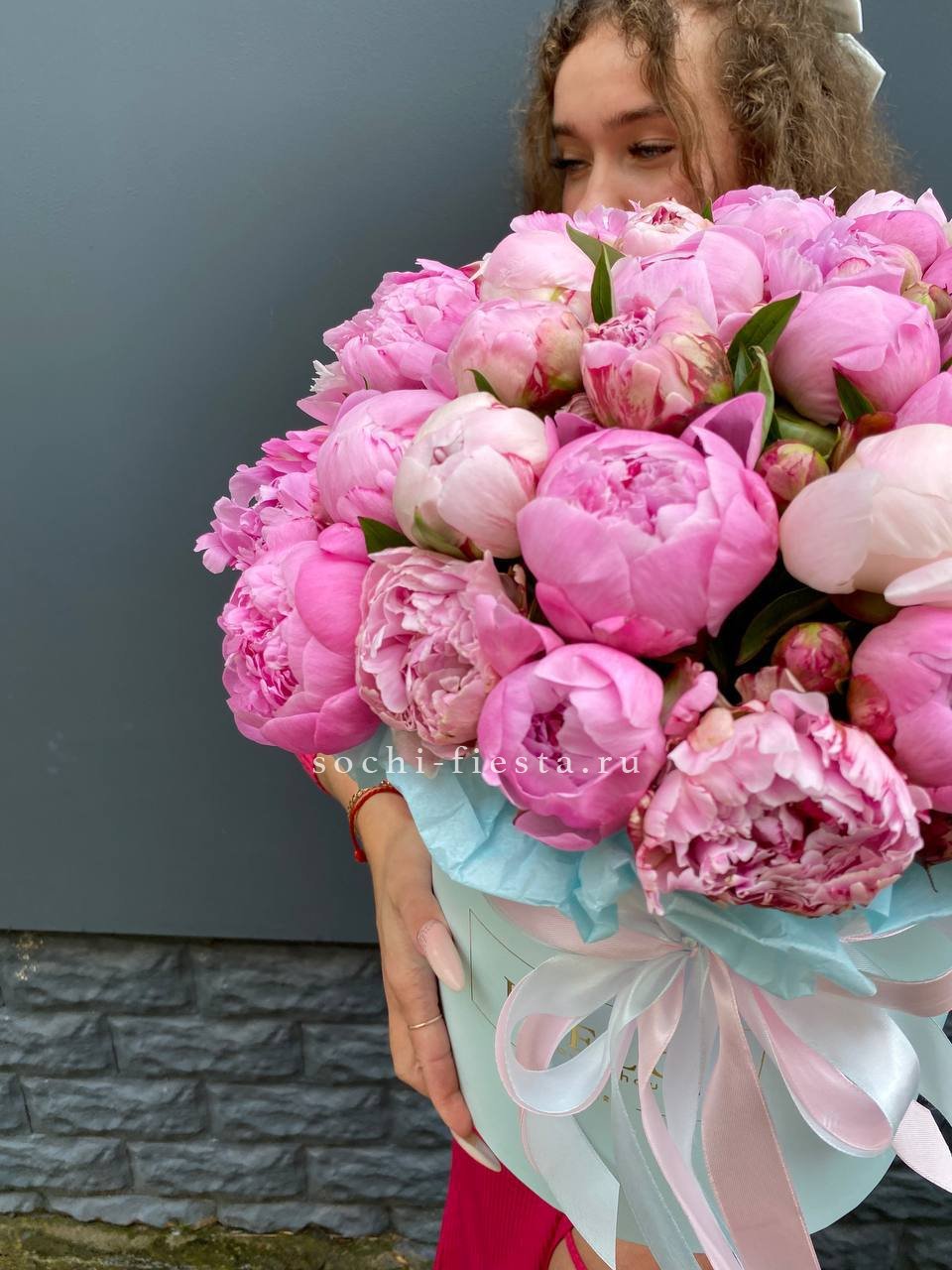 Пятьдесят один пион в одной композиции — это объём, который заполняет собой всё вокруг. Бутоны плотно уложены в цилиндр, создавая эффект цветочного облака. Такой масштаб запоминается с первого взгляда.