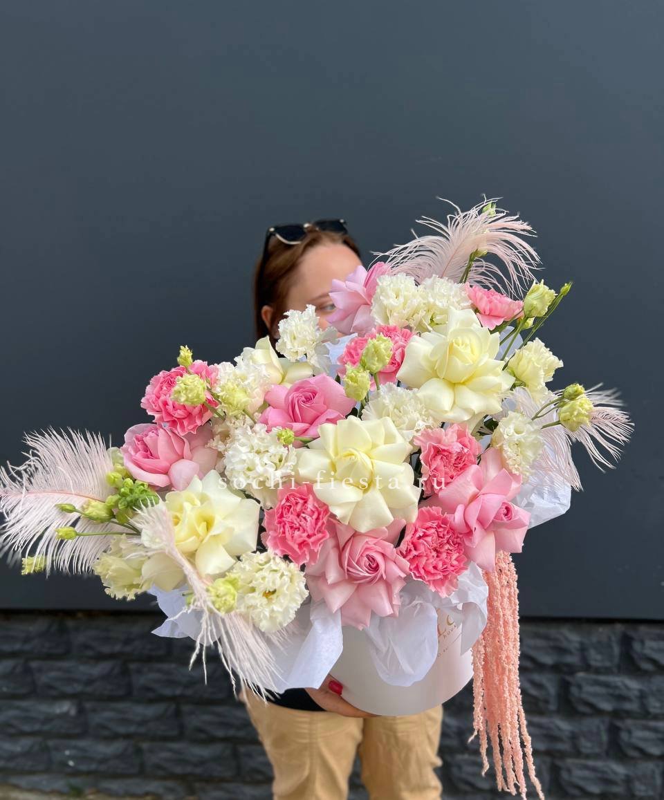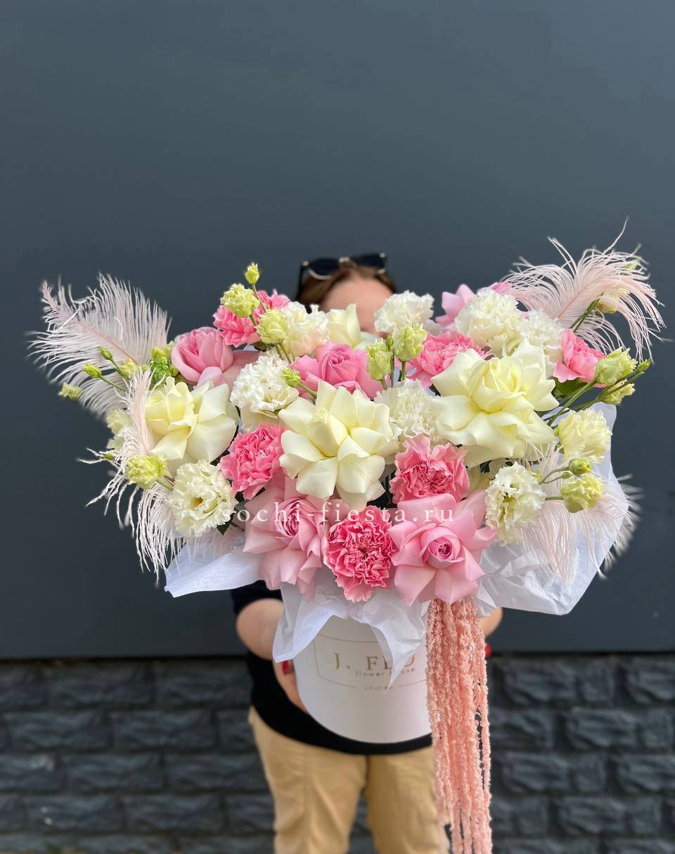 Воздушная композиция в пастельной гамме с акцентом на фактуру раскрытых бутонов. Пионовидные розы и эустома создают объёмный силуэт, а хлопок добавляет графичности.
