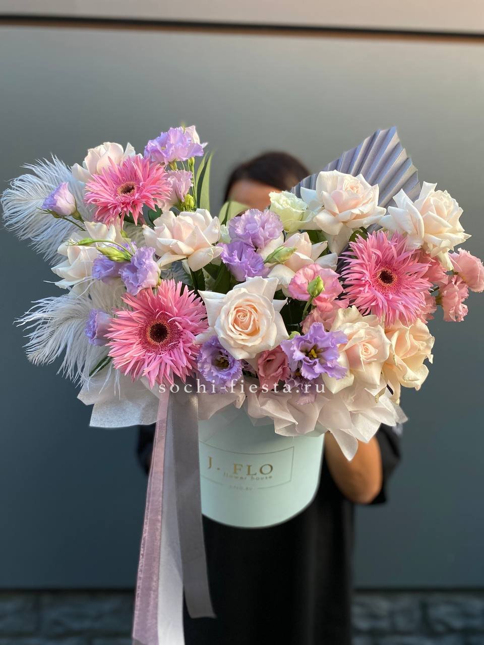 французские розы, эустома, герберы, цилиндр D20,  бумага тишью.