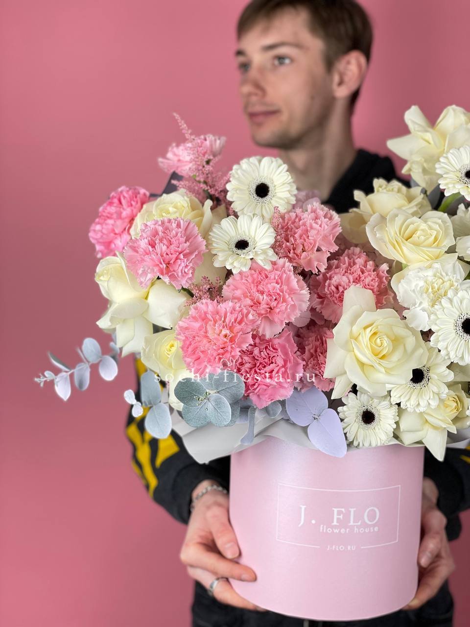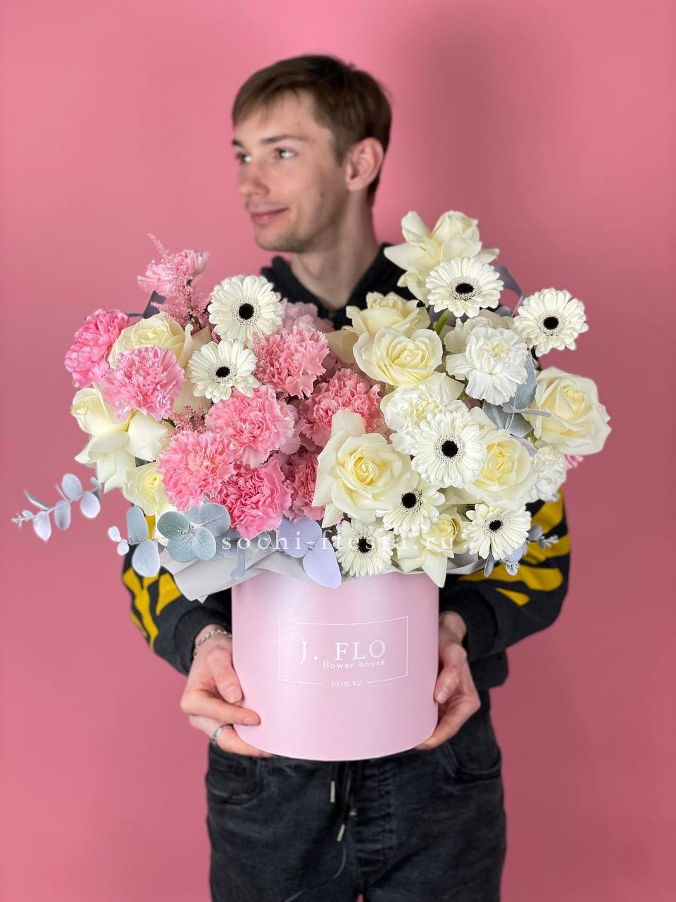 Пионовидные розы Мисти Баблс и экзотичные орхидеи Цимбидиум создают композицию с мягкими переходами оттенков. Цилиндрическая форма собирает цветы в плотную структуру с выразительным силуэтом.