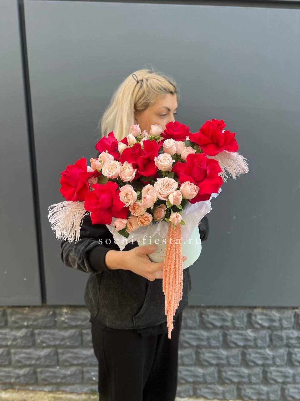 Экзотичная протея задаёт тон всей композиции, где розовые и красные розы переплетаются с фактурным озатамусом. Диантус добавляет графичности, а эвкалипт смягчает линии.