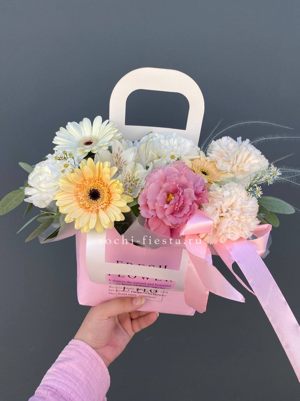 Герберы и альстромерии собраны в яркую компактную композицию. Диантусы заполняют пространство между соцветиями и создают лёгкую дымку. Удобный формат в сумке-кашпо для размещения на столе или полке.