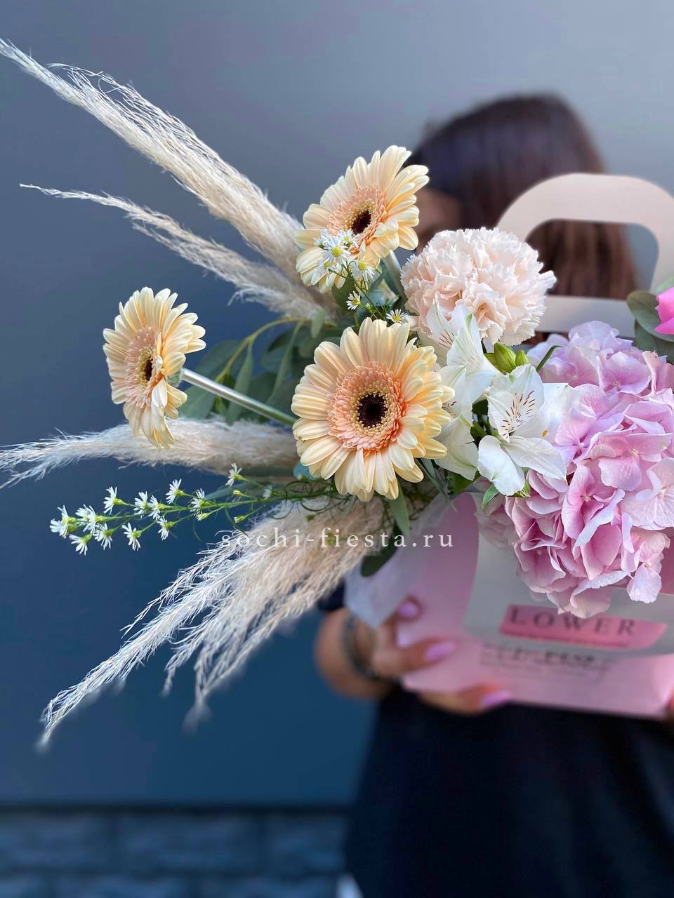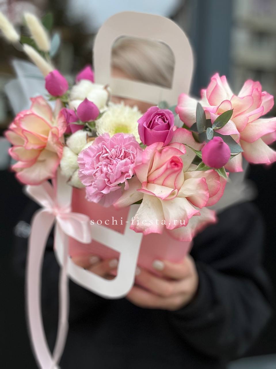 розовая роза, пионовидная роза, диантус, гортензия, эвкалипт, лента, сумка-кашпо.