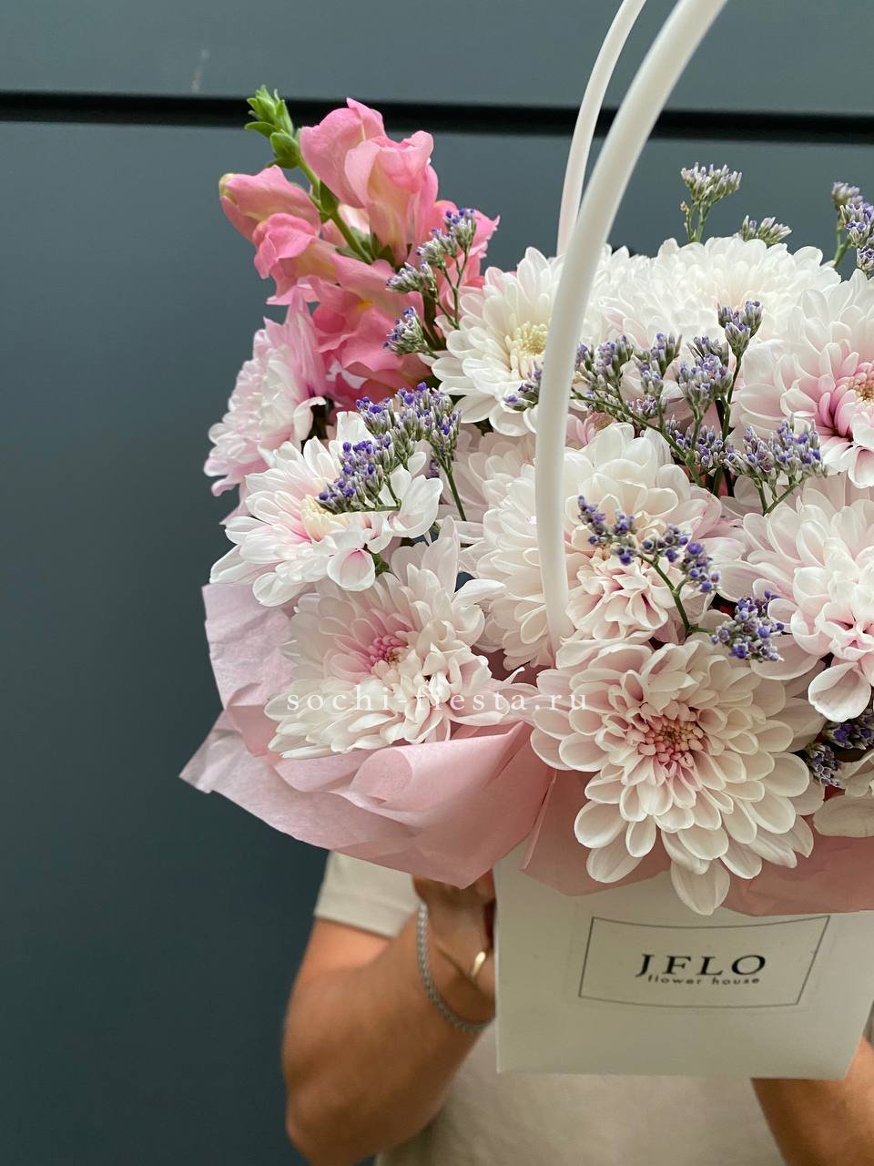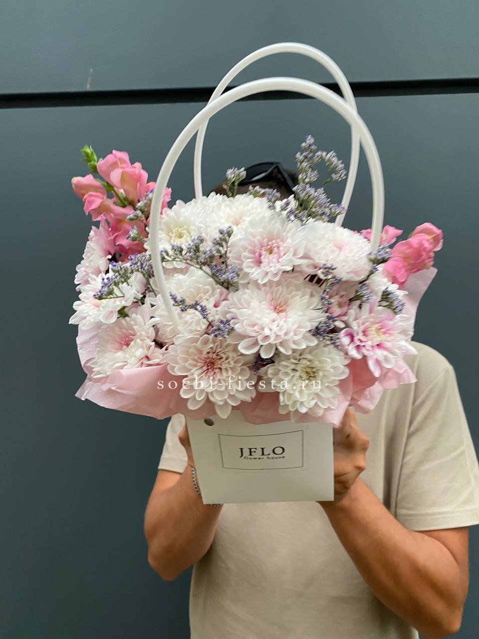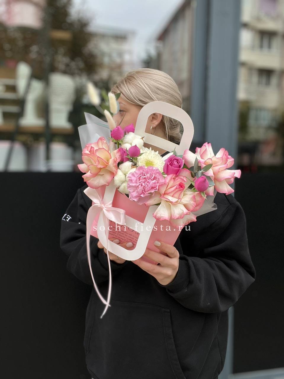 Пышные головки пионовидных роз задают объём, а мелкие соцветия диантуса разбивают плотность. Гортензия добавляет воздушную текстуру, эвкалипт смягчает линии. Композиция в сумке-кашпо выглядит свободно и живо.