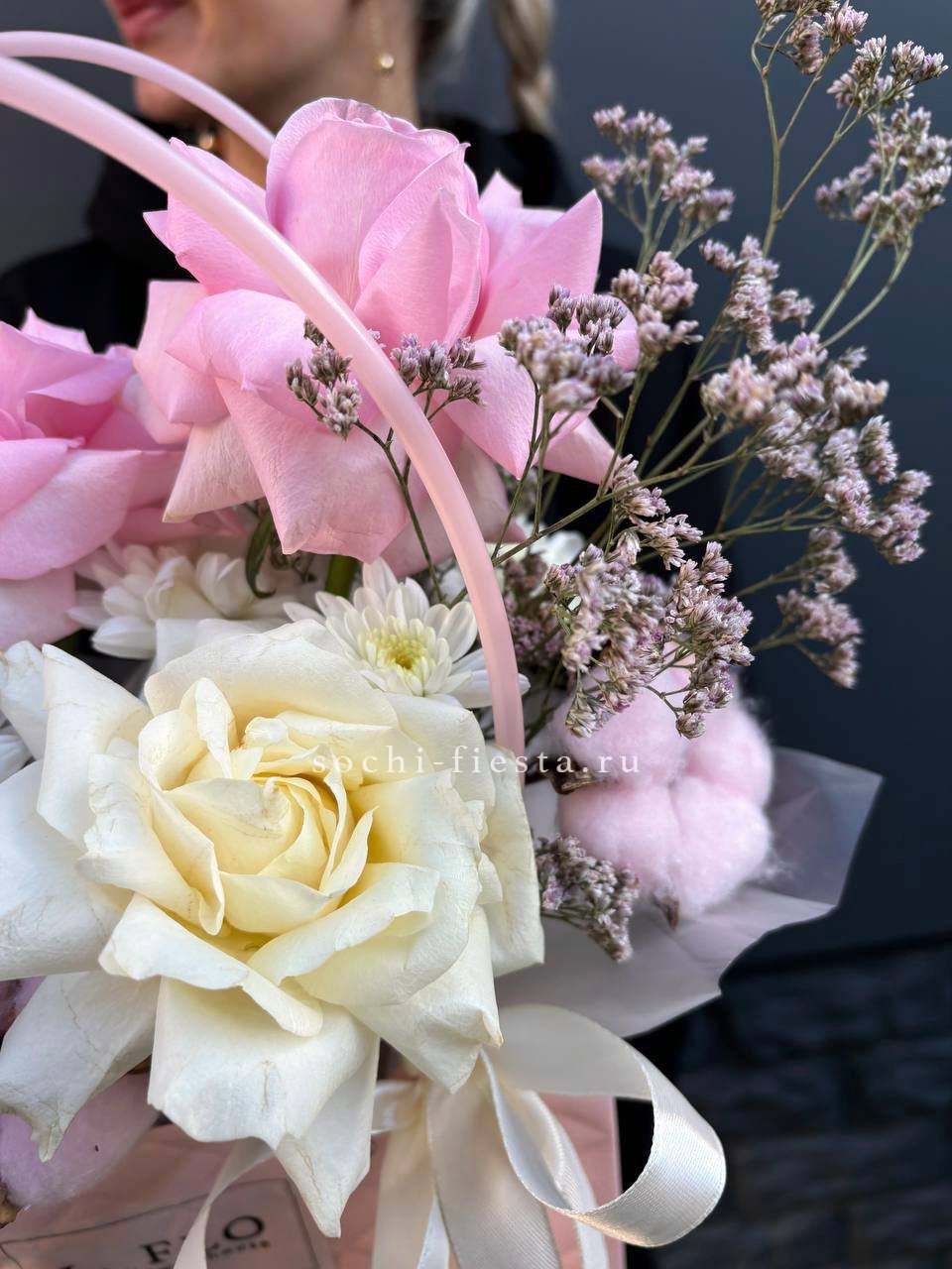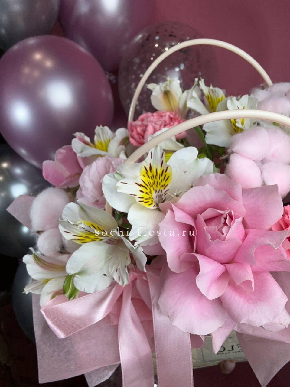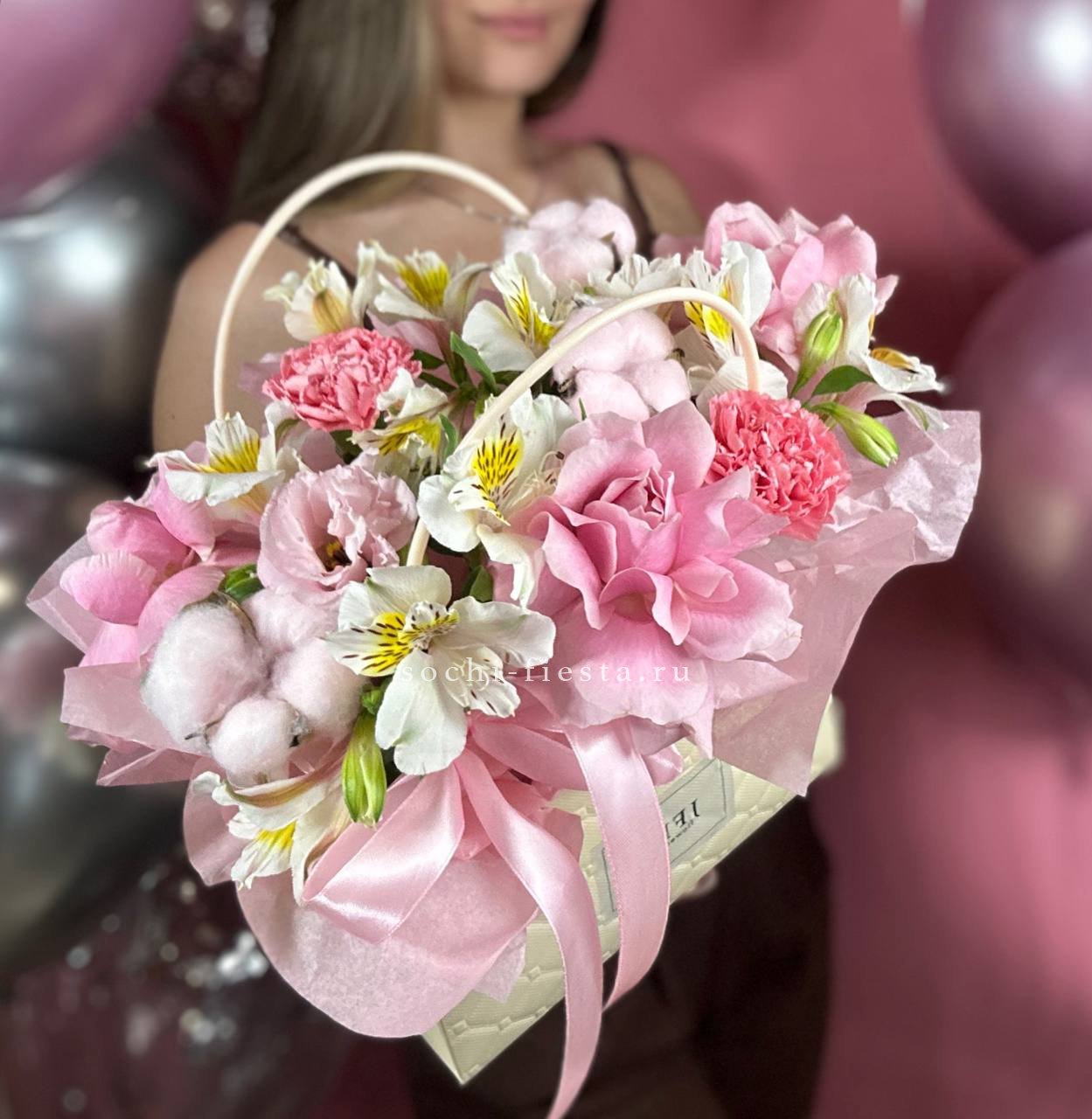 альстромерии (в зависимости от сезона, возможна замена), розовые розы, хлопок, диантусы, лента, сумка-кашпо.