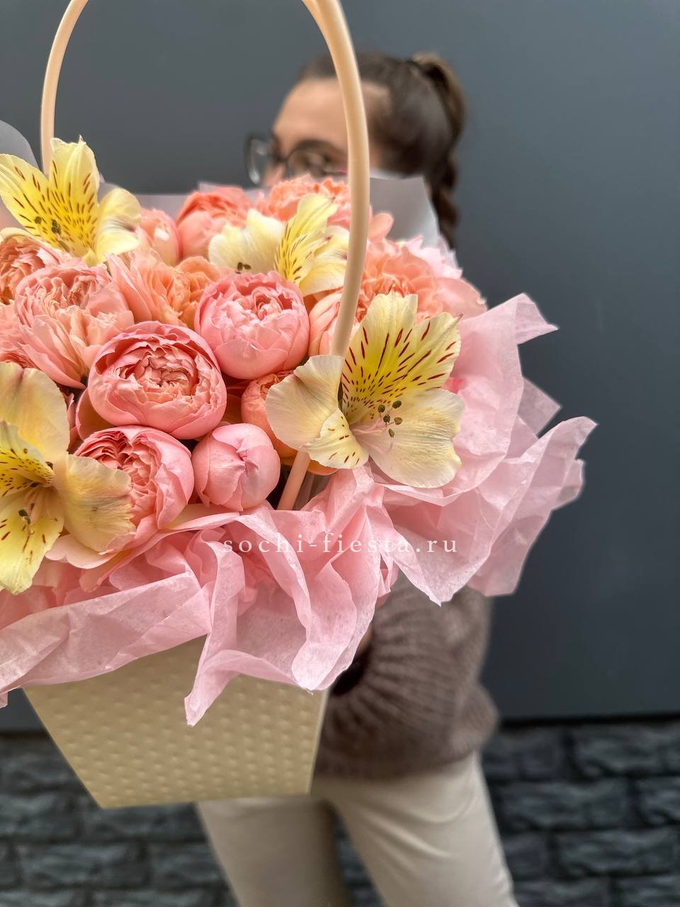 пионовидные кустовые розы, альстромерии, сумочка, лента.