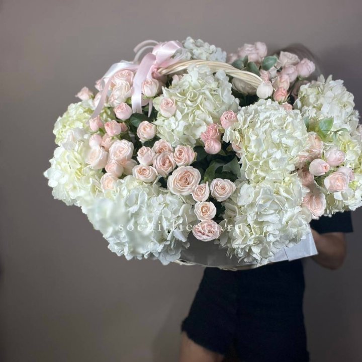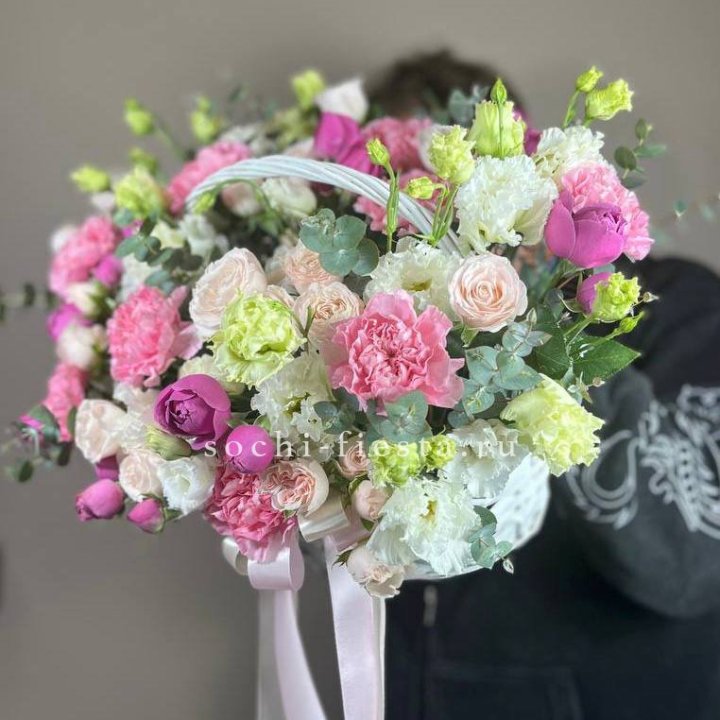 Состав корзин в Стерлитамаке определяется текущими поставками и сезоном. Розы Freedom, Mondial, Cappuccino — для классических куполообразных аранжировок. Пионы в мае-июне из свежих поставок: Sarah Bernhardt, Red Charm, Bowl of Cream — главный сезонный продукт. Хризантема, альстромерия, гербера — для объёмных торжественных наполнений. Эустома, ранункули — для садовых корзин. Флорист строит состав под конкретный запрос.