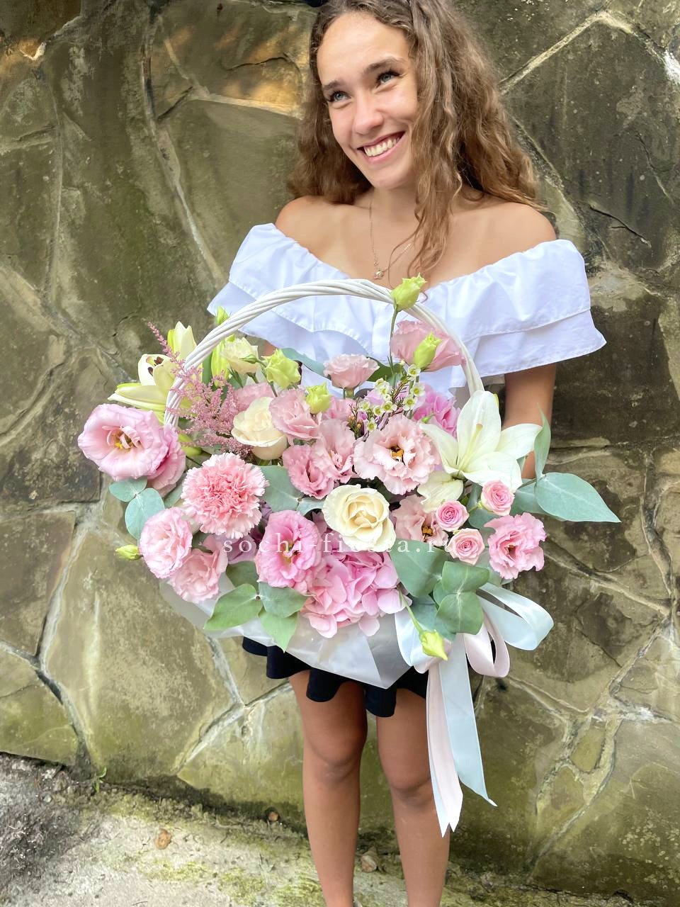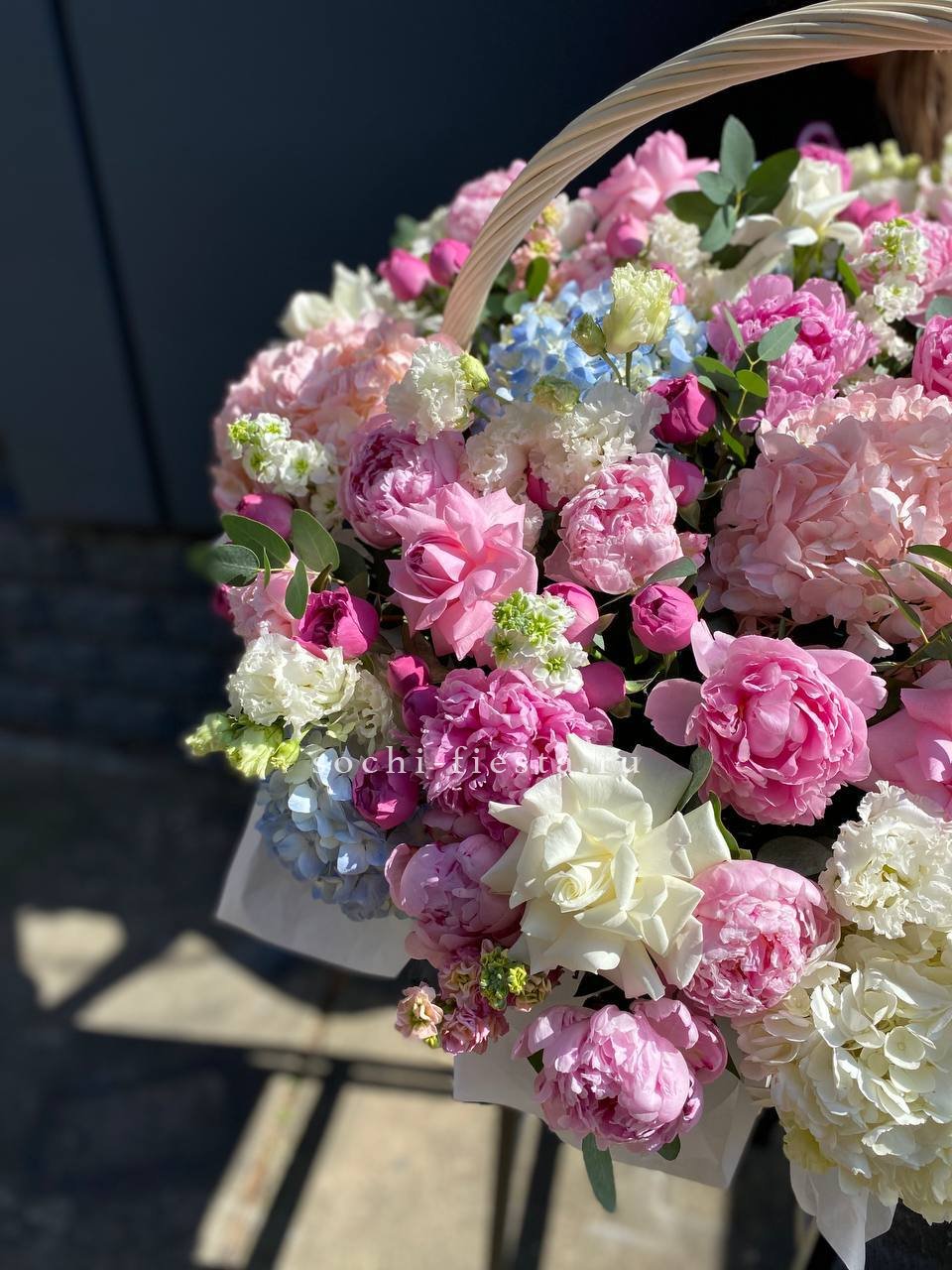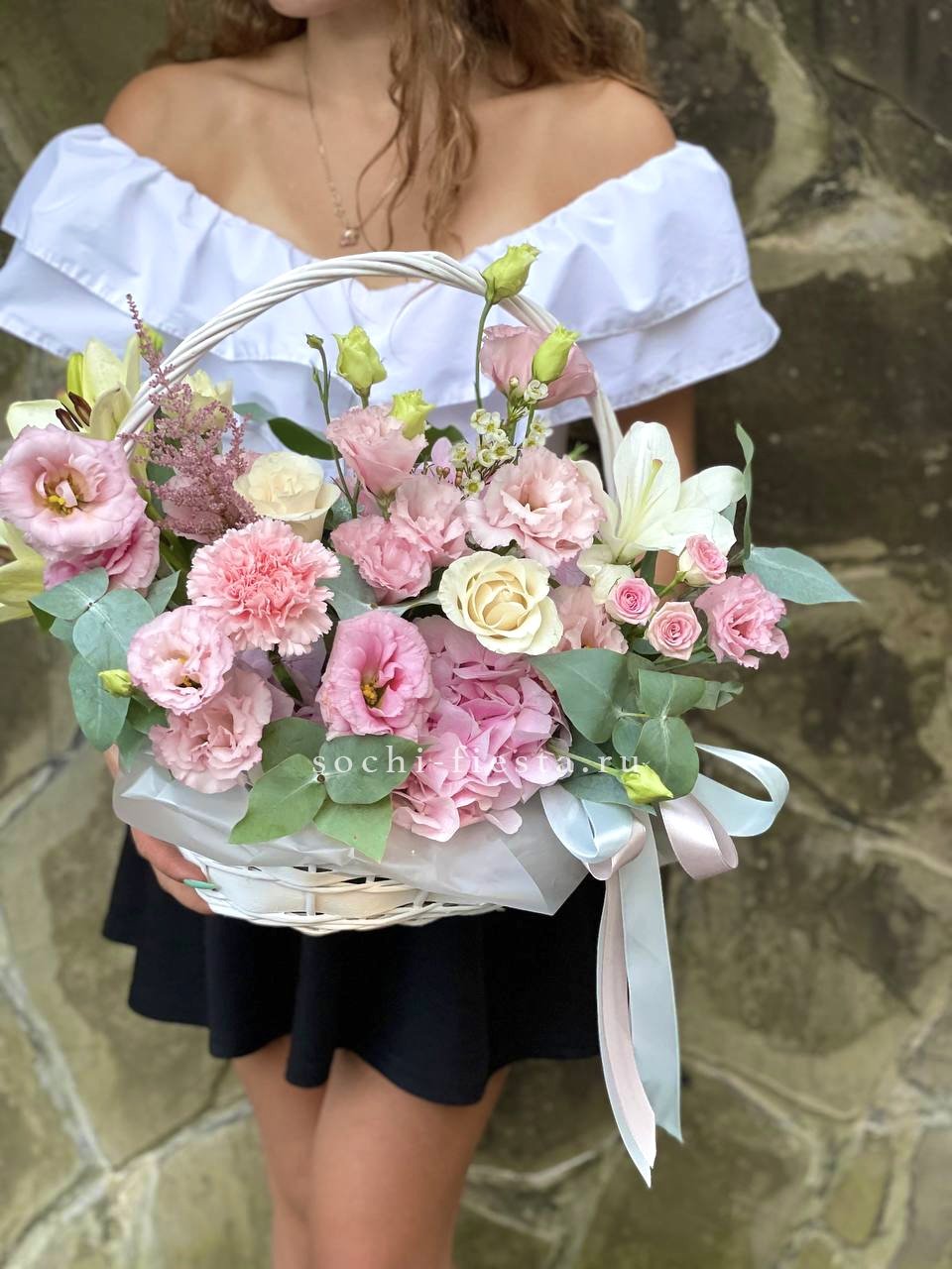 гортензия нежно-розовых оттенков, эустома, лилии, диантус, кустовая роза, эвкалипт, вспомогательная зелень, лента, светлая корзина.