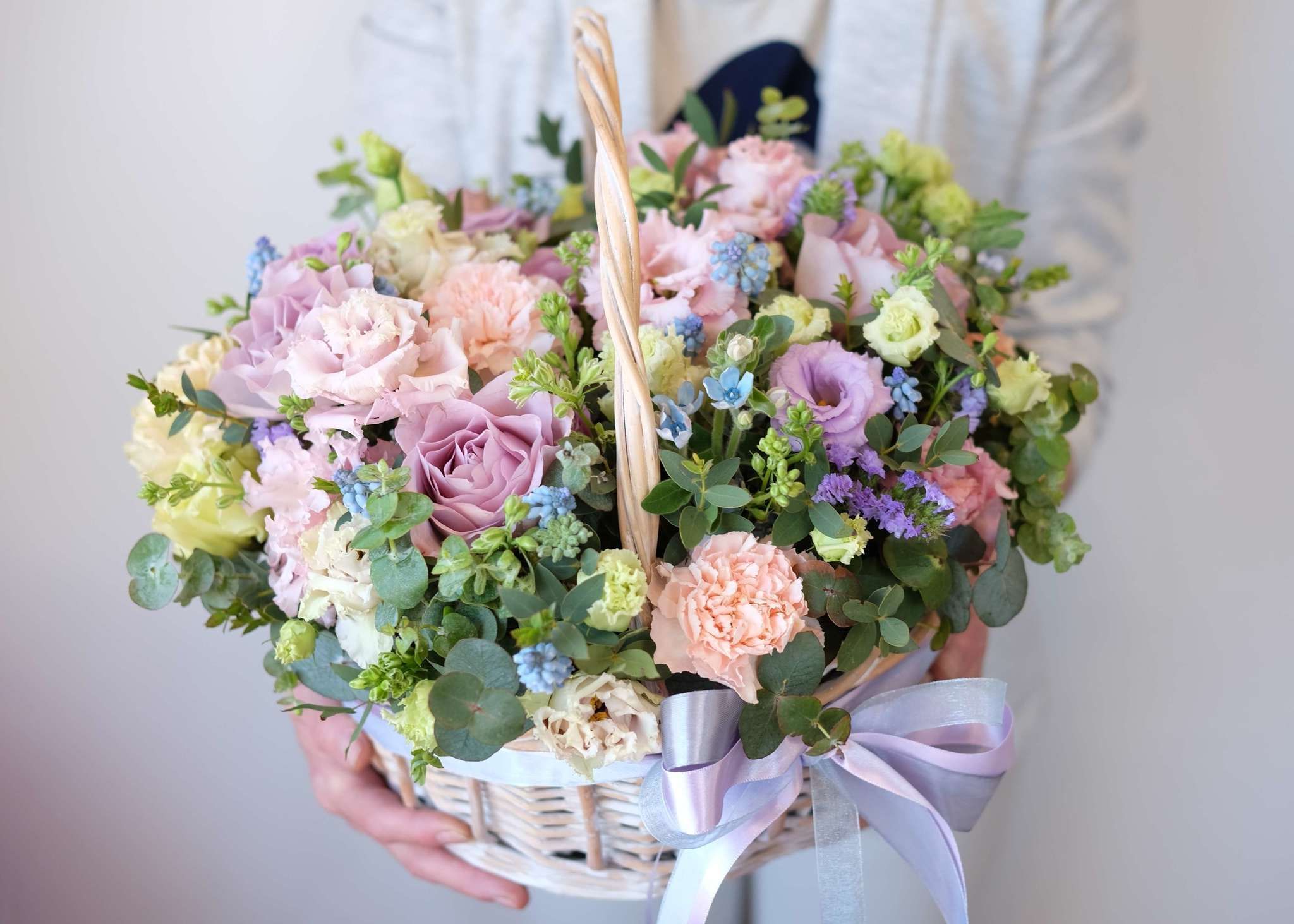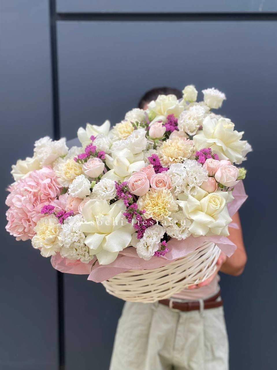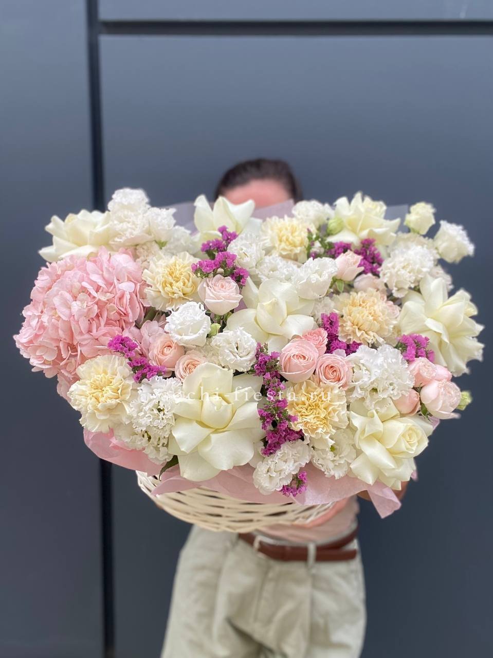 Здесь идеально сочетаются крупные, бархатистые бутоны роз, облака гортензии и мелкие акцентные цветы. Получилась невероятно воздушная и легкая композиция, которая мгновенно создает ощущение праздника и весеннего настроения. Стильный бант завершает этот изысканный образ.