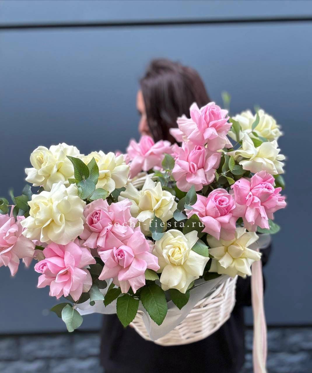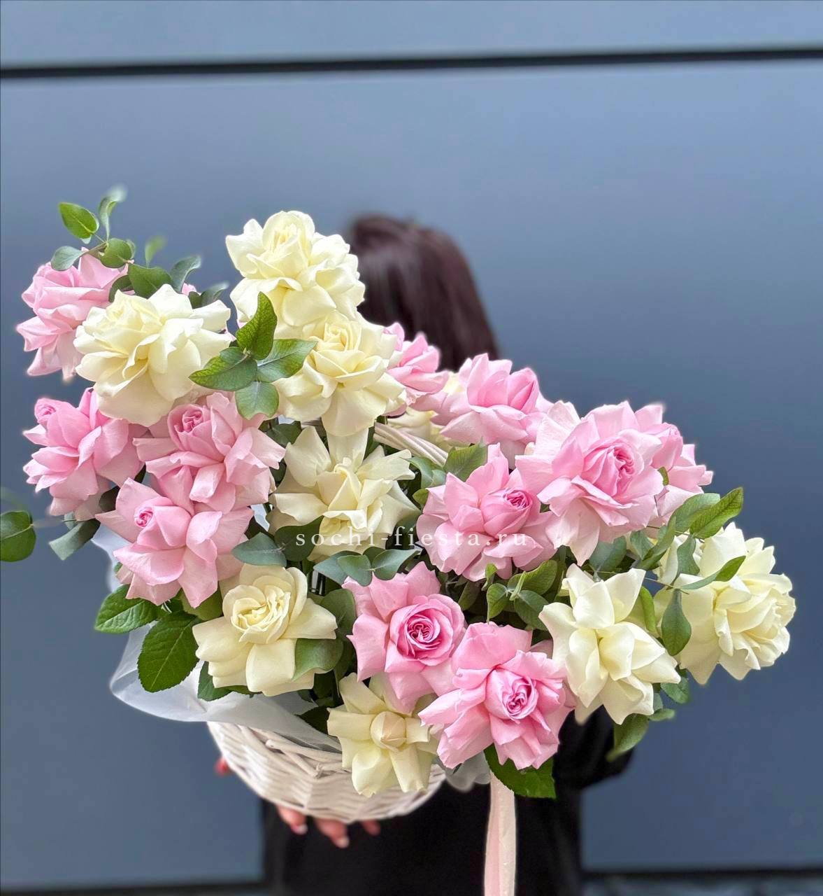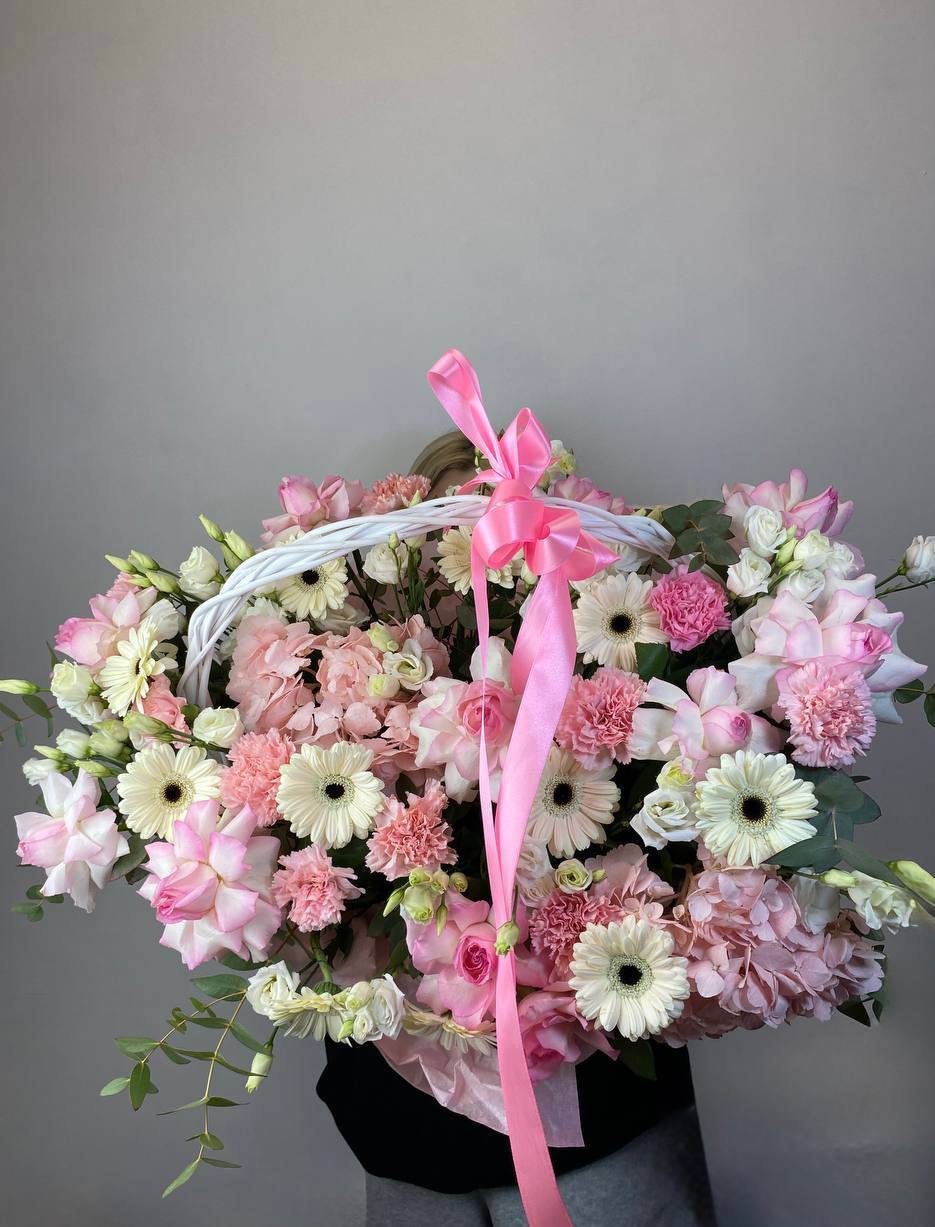 Гортензия и эустома задают объём, а яркие герберы расставляют цветовые акценты по всей композиции. Диантус и хайди добавляют воздушности, эвкалипт завершает силуэт мягкими линиями. Корзина держит форму и создаёт устойчивую основу для пышной композиции.